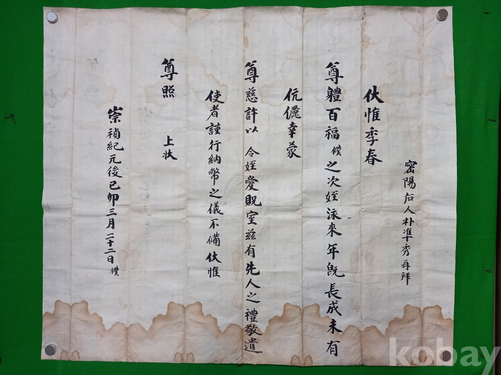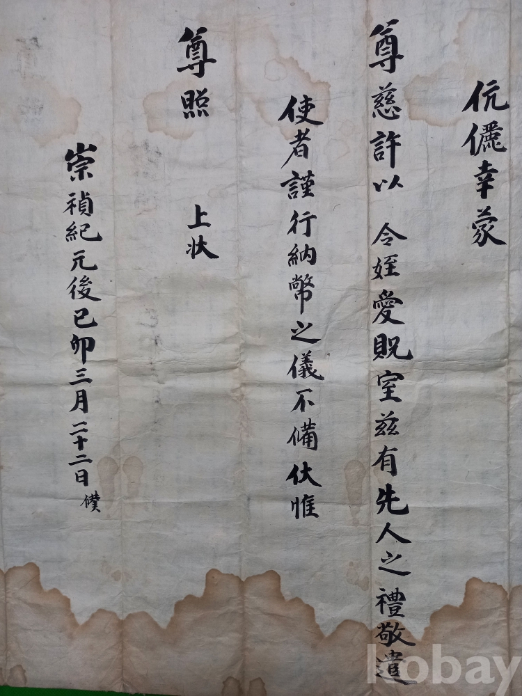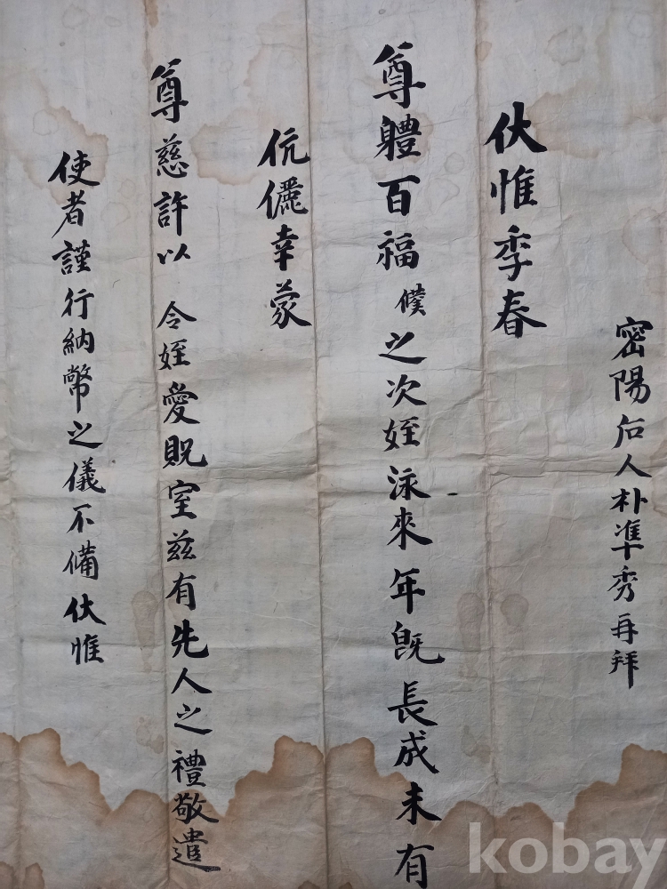 이 문서는 조선 시대의 혼서(婚書)로, 신랑 측 혼주가 신부 측 혼주에게 예물과 함께 보내는 편지입니다. 전통 혼례 절차 중 '납폐(納幣)' 단계에서 함에 넣어 전달하며, 가문 간의 결합을 공식화하는 중요한 문서입니다.당시 박씨 가문과 상대 가문 사이의 소중한 인연을 맺는 공식적인 증표입니다.