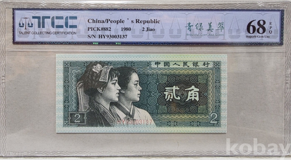 -1980년 중국 인민은행 발행 2각 지폐 TCC68 고등급 입니다.
