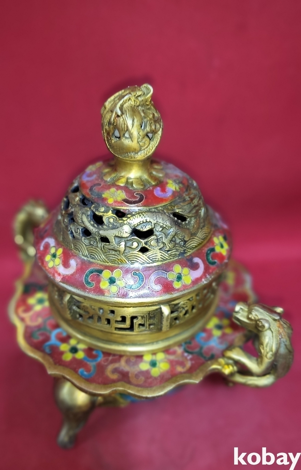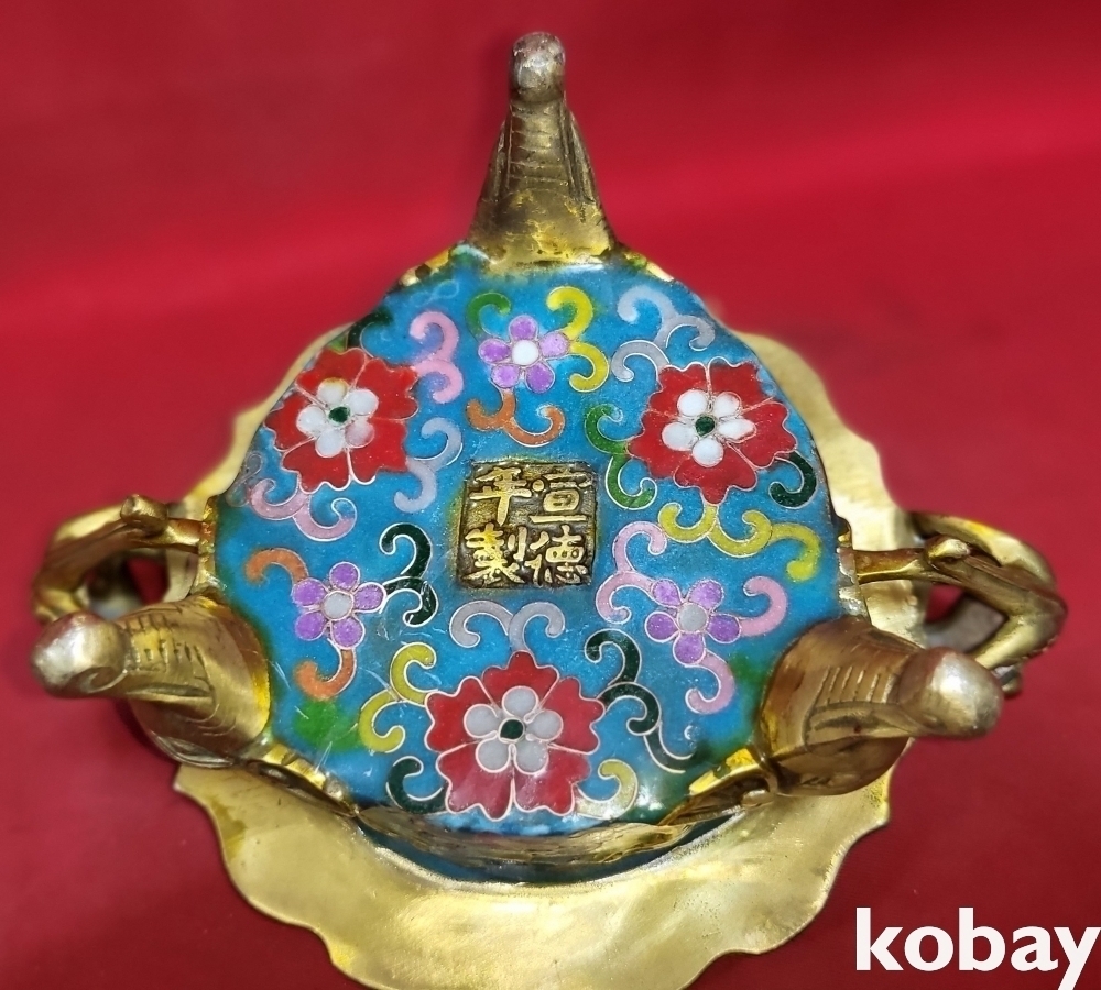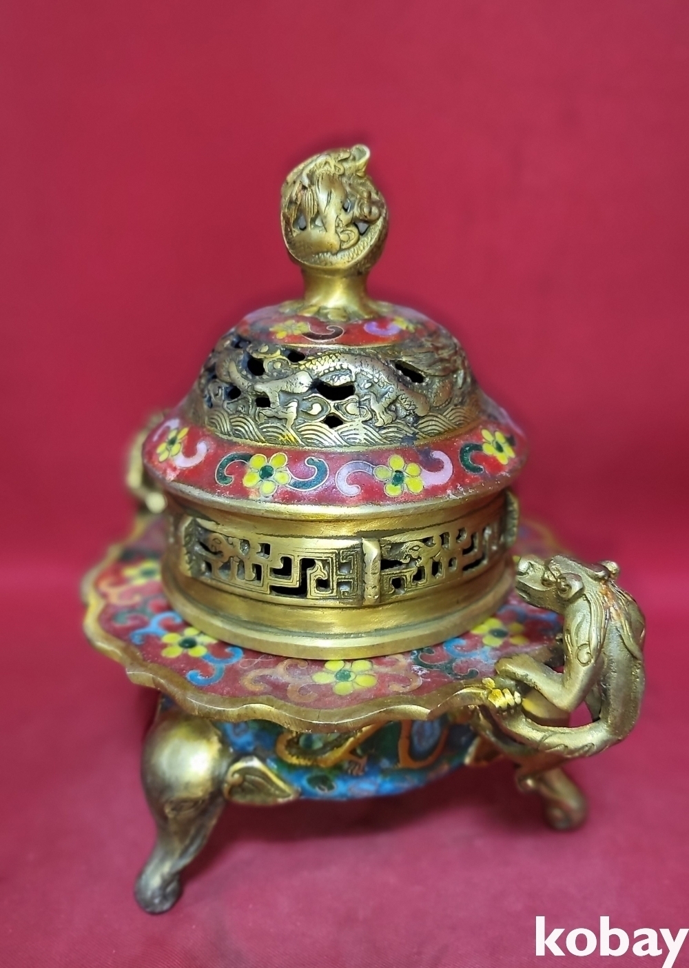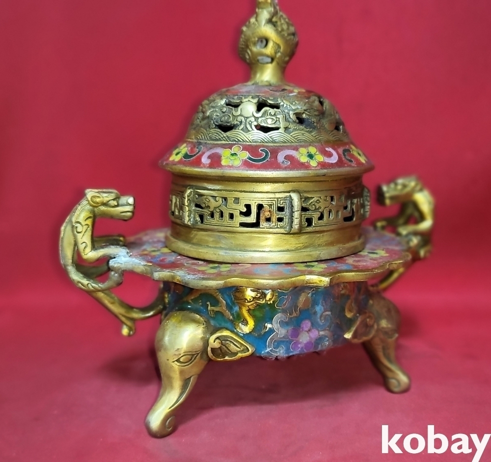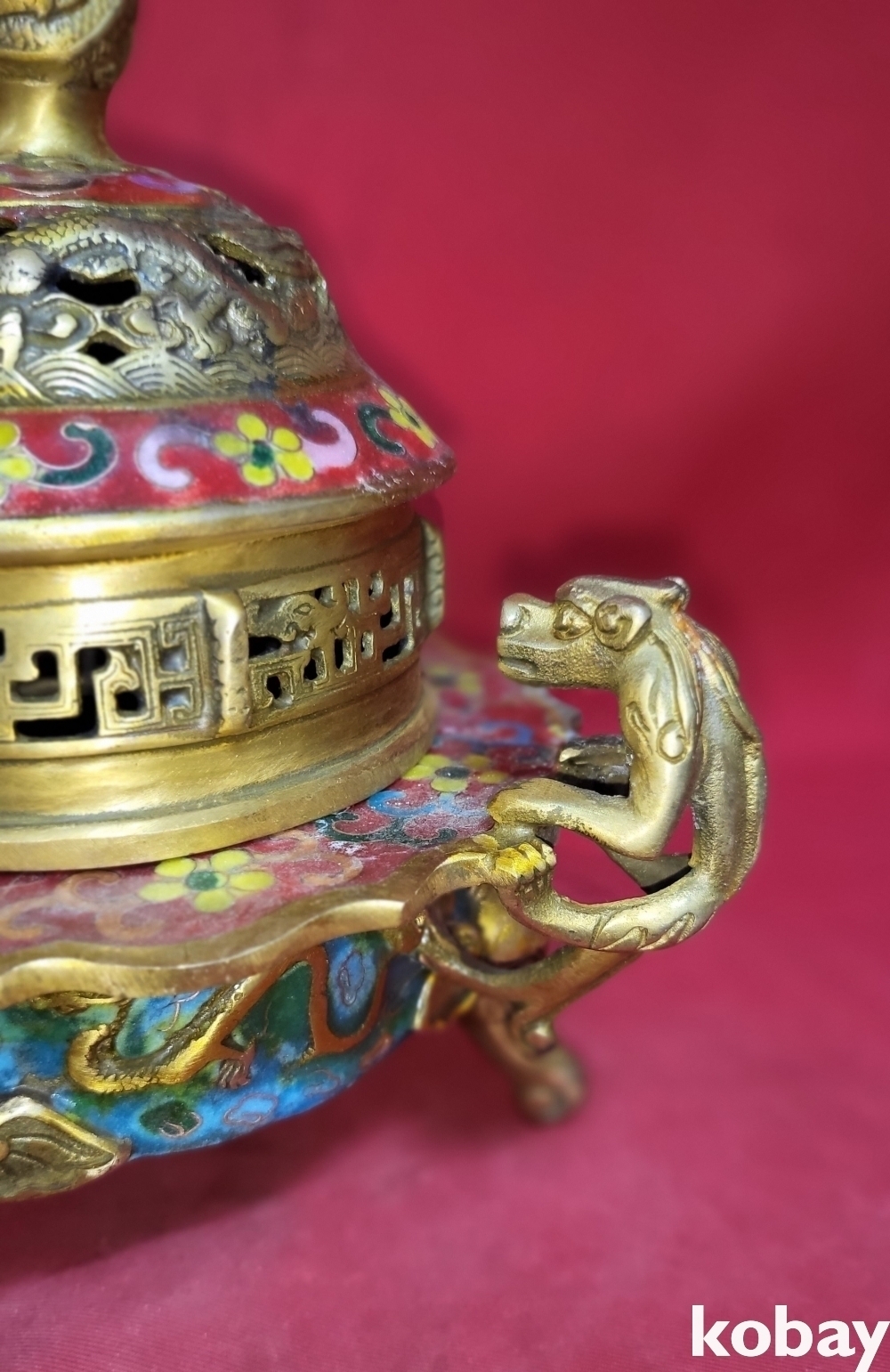 선덕연제 관지있는 동태범랑(칠보) 뚜껑 용문양에 해마 양귀와 삼족 코끼리 문양 향로입니다,