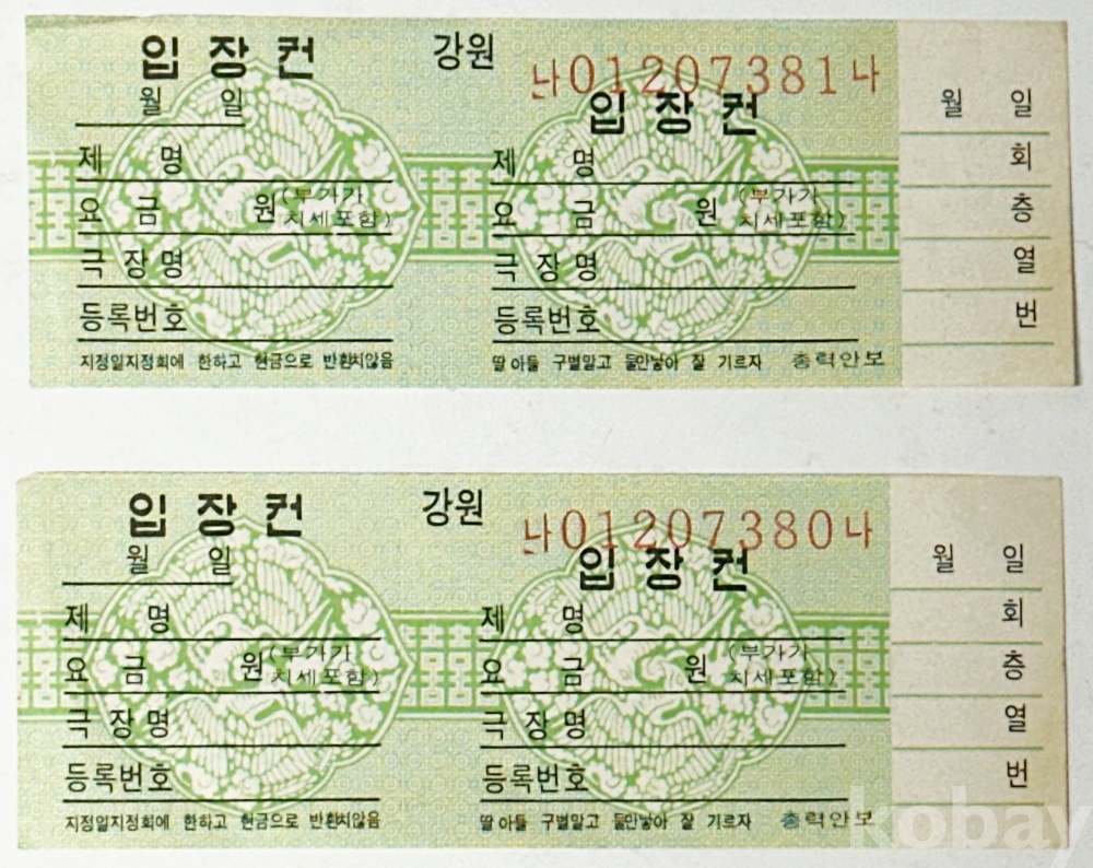 상품설명 | 강원도 지역 극장에서 사용되었던 종이 입장권이다. 당시 영화관의 탈세 방지 및 세수 관리를 위해 정부가 직접 입장권을 인쇄하여 배부하였다. 2매 일괄. |