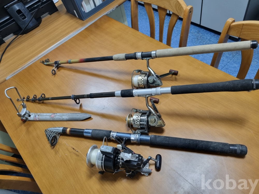 사용감있는 릴 낚싯대 3점과 받침대 포함입니다.