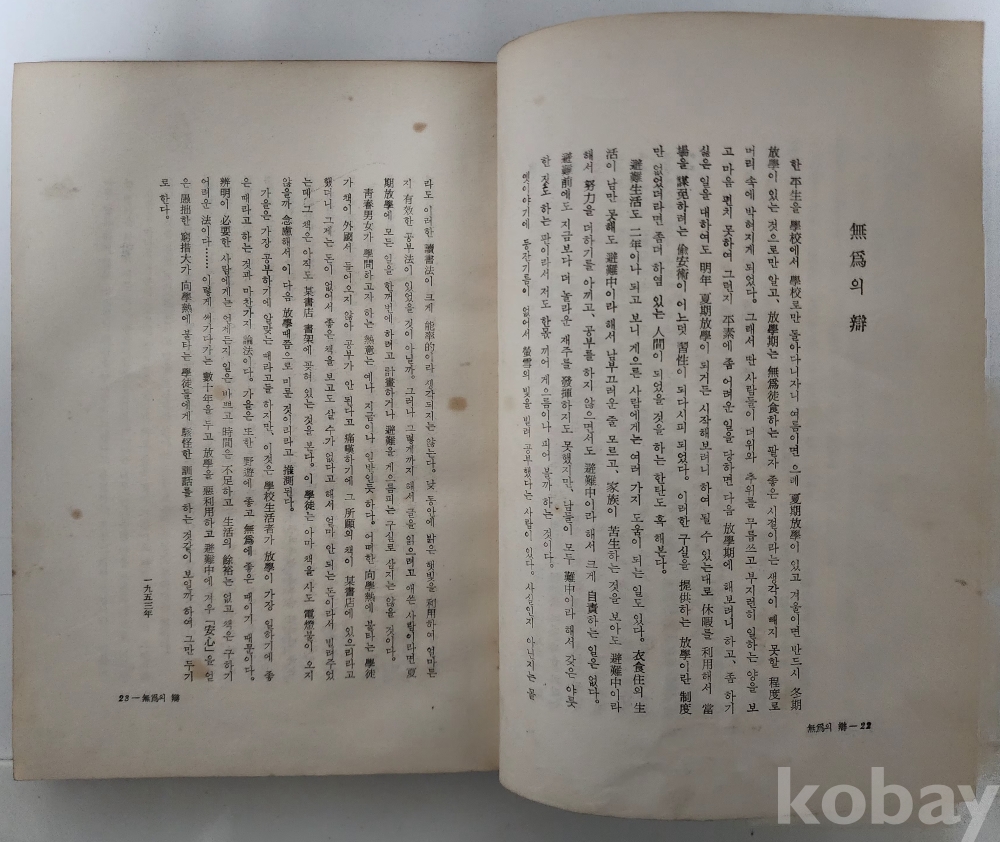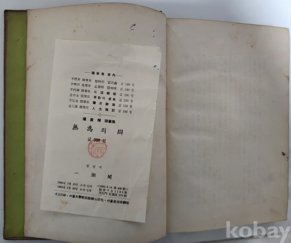 자료명/ 저자/ 발행/ 형태사항 | 『무위의 변 · 無爲의 辯』/ 權重輝 著/ 서울: 一朝閣, 1965.1.30._초판/ 313p. 변색 및 낡음. |