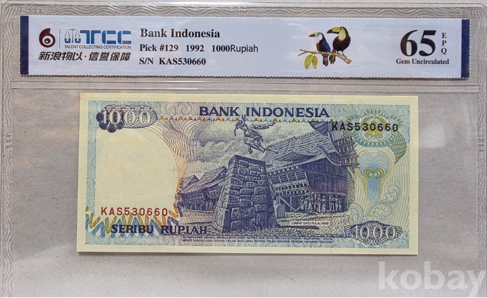 -1992년 인도네시아 1000루피아 지폐 TCC65 등급 입니다.