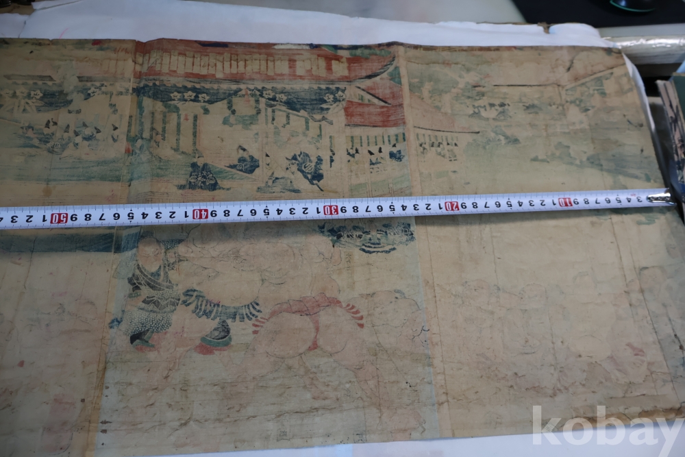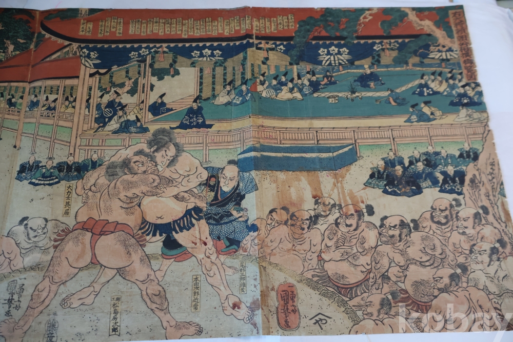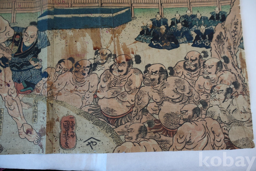 우키오에 목판화 원본 구니요시 임니다 스모 선수를 가진 귀한 명품 임니다 KUNIYOSHI UTAGAWA (1798-1861) 귀한 소제의 명화 임니다 세월의 흔적이 보이는 극히 귀한 명화