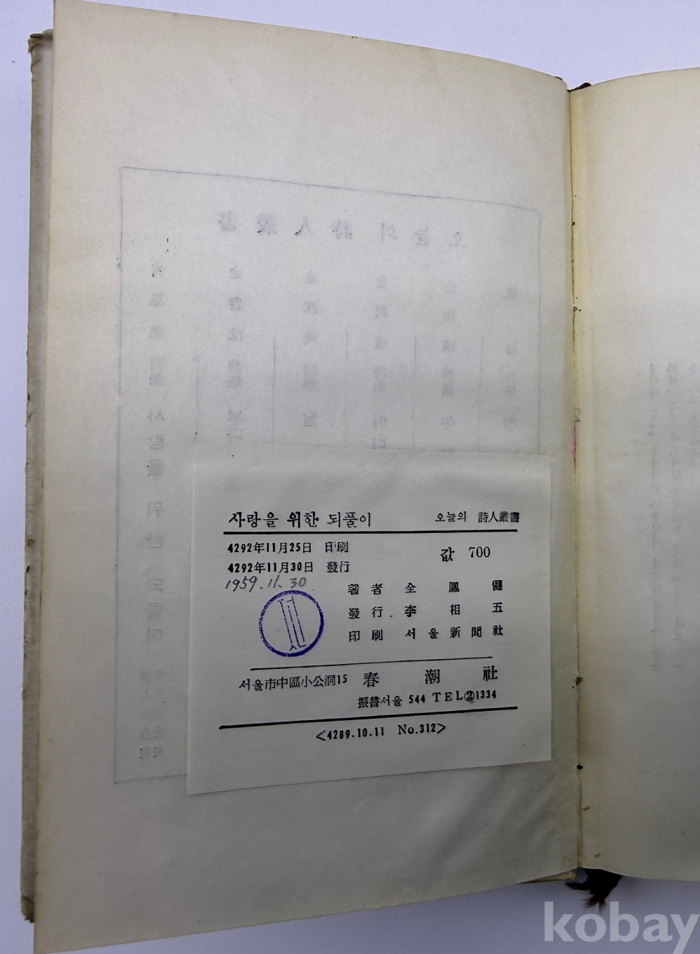물 품 명 | <취향지가> [26] 1959년 발행, 제3회 시인협회상을 수상한 전봉건(全鳳健) 시집 [사랑을 위한 되풀이] 초판본 1책 | |||||