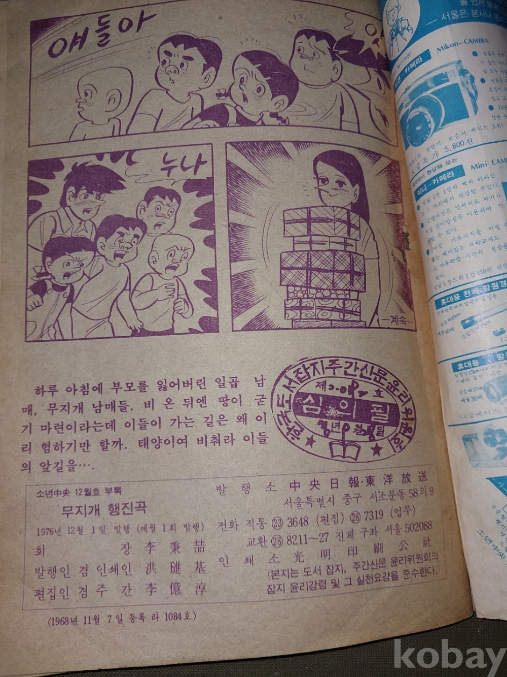(만화) 무지개행진곡 - 소년중앙 1976년 12월호 부록/ 세월의 흔적이 있으나 낙장 낙서는 없는 완전본임