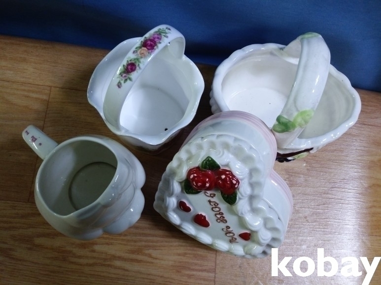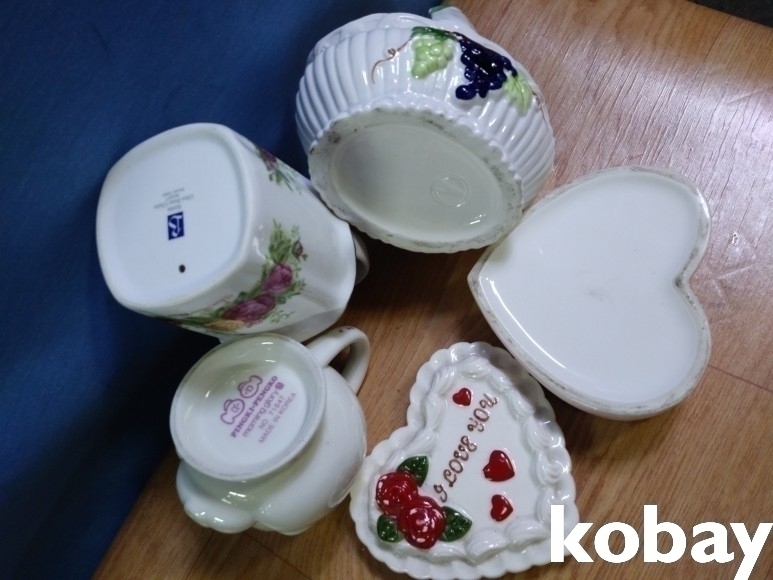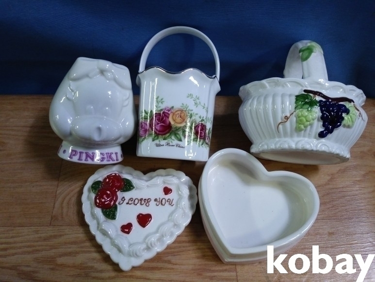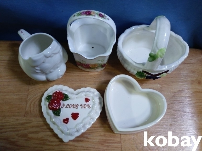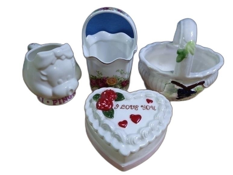 하트 모양 보석함, 핑키 컵, 손잡이 바구니 도자기 그릇 입니다.