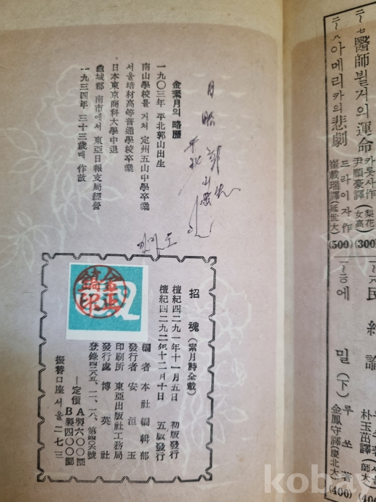 초혼, 소월시집 4292년 박영사 134페이지 - 중고서적입니다