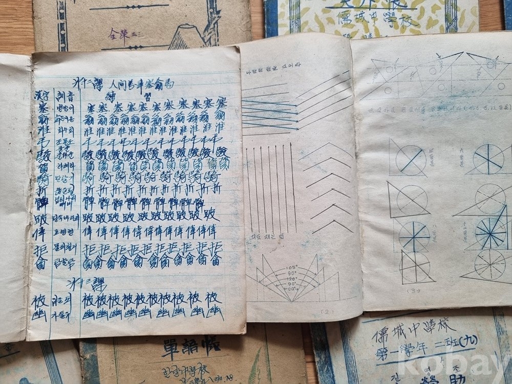 기술/실기: 중등 도법(도형 그리기), 산술 필기장, 삼각법(수학).