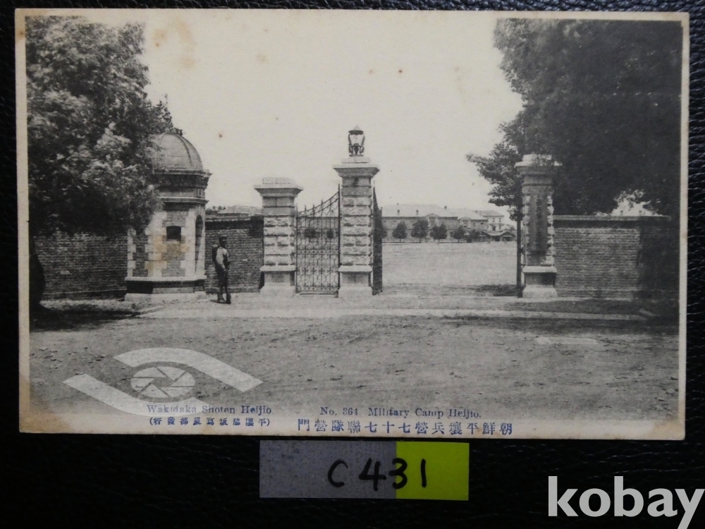 ▣근대한국엽서(진본): 조선 평양 병영 77연대 부대 정문 모습, 매우 귀함/1매/역사자료,일제시대,일제강점기,사진엽서,그림엽서,회엽서. C431