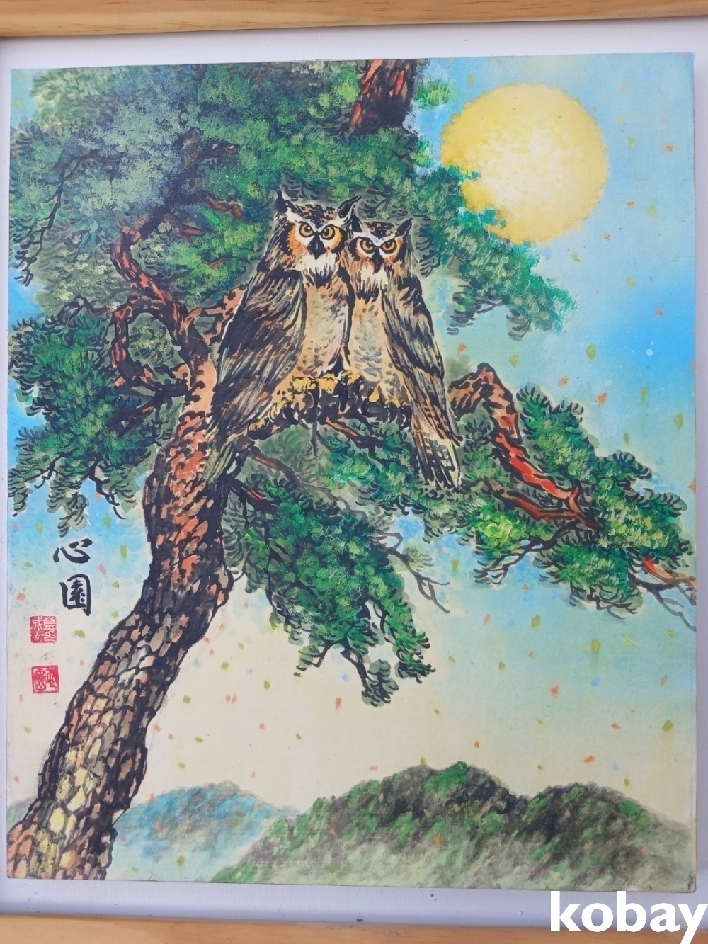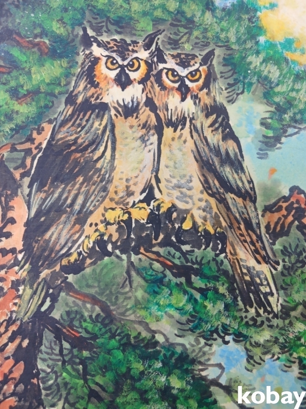 소나무에 부엉이 한 쌍을 표현한 수채 그림 입니다.