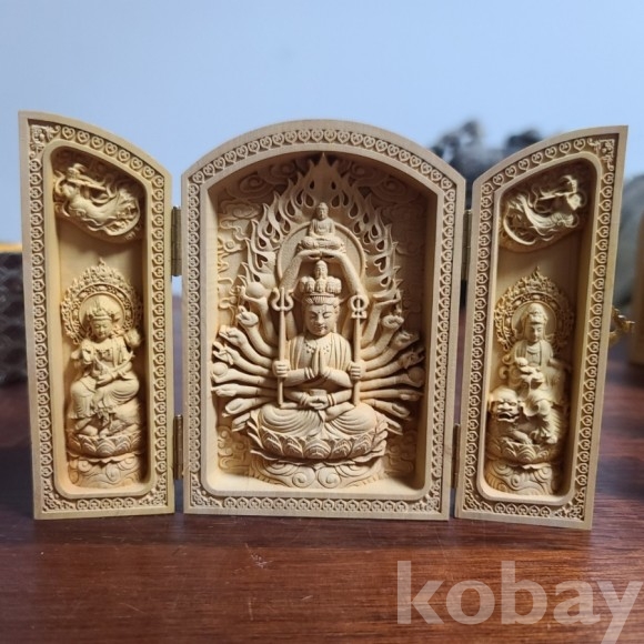 섬세하게 조각된 나무 불감입니다. 경첩이 달려있어 닫을 수도있고 펄쳐 둘수도 있습니다. 장식용으로도 좋고 작아서 호신용으로 가능합니다. 즐거운 감상되세요