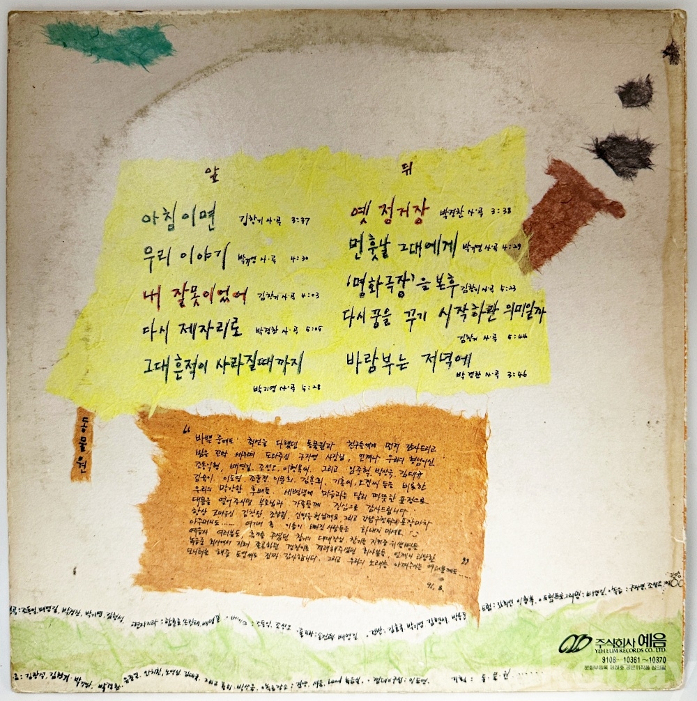 상품 설명 | Side A 1. 아침이면 2. 우리 이야기 3. 내 잘못이었어 4. 다시 제자리로 5. 그대 흔적이 사라질때까지 Side B 1. 옛 정거장 2. 먼훗날 그대에게 3. '명화극장'을 본 후 4. 다시 꿈을 꾸기 시작하란 의미일까 5. 바람부는 저녁에 ※ 동물원 멤버 박기열, 유준열 / 편곡 배영길 사인 포함.