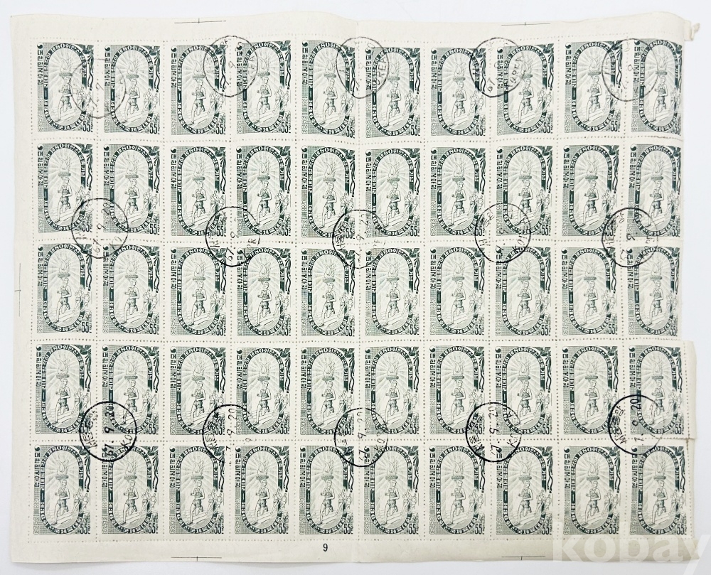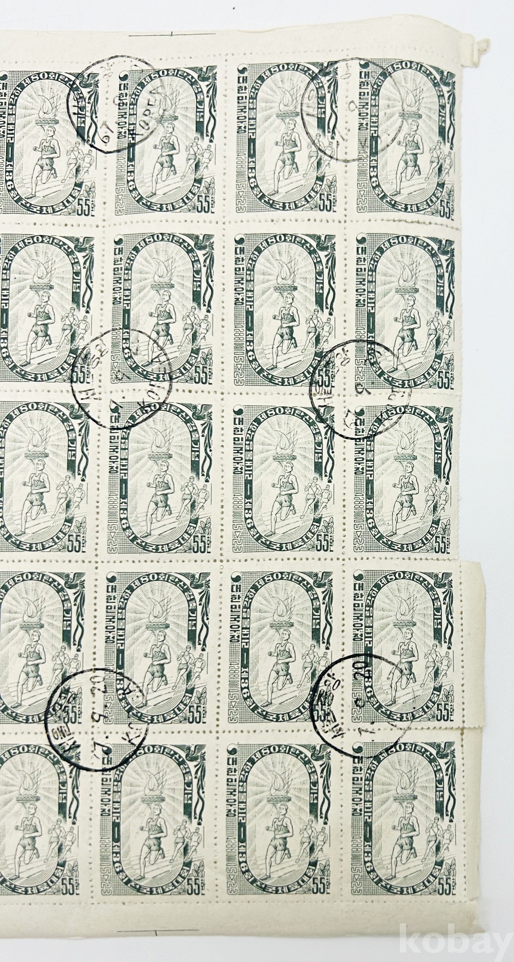 상품 설명 | 1955년 이승만 대통령 제80회 탄신경축기념과 제36회 전국체육대회를 기념하여 발행한 55환 우표이다. 사용제(주문소인), 1967.9.20. | ||