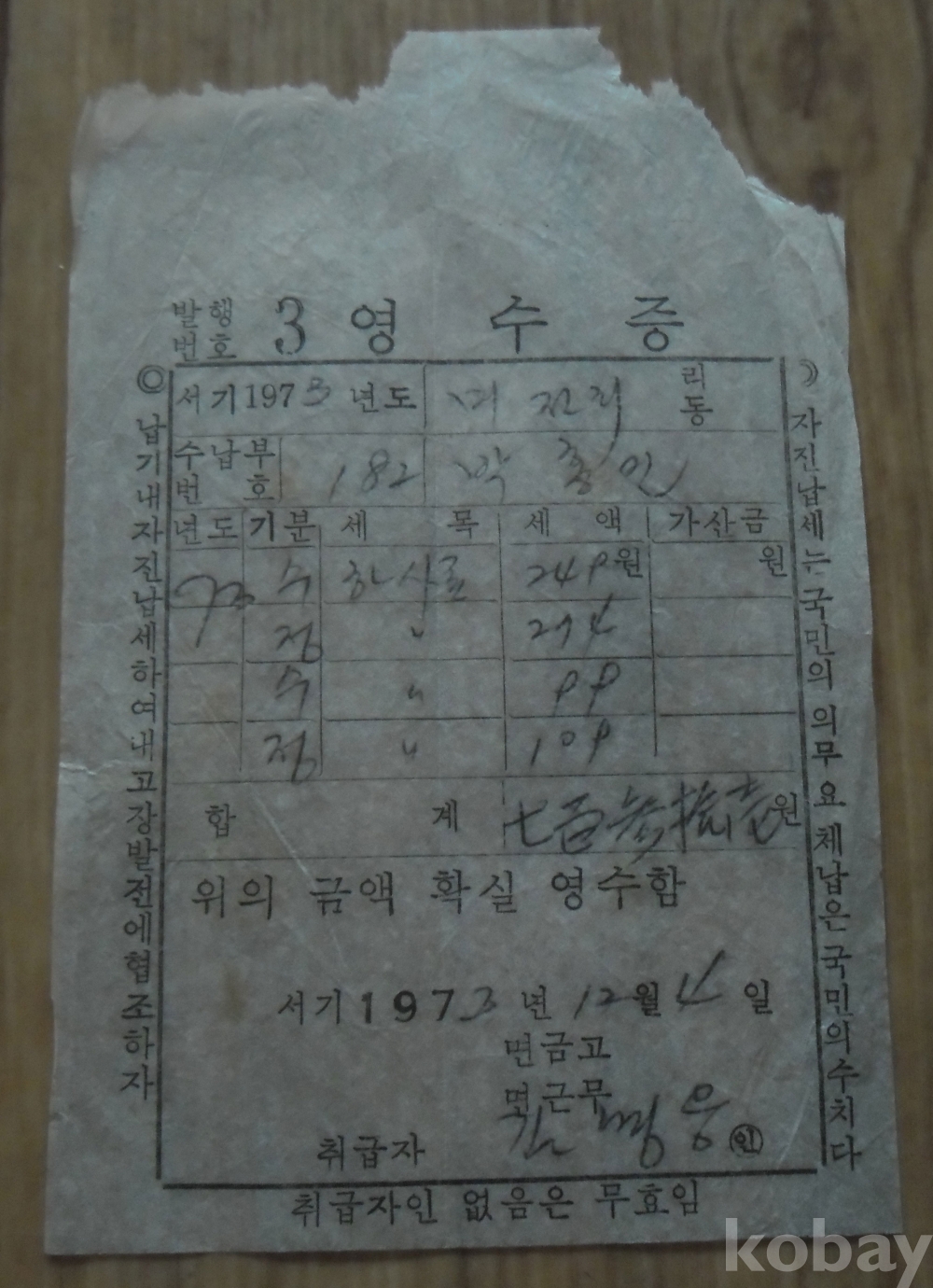 1972년 영동군용산면 하천사용료 영수증