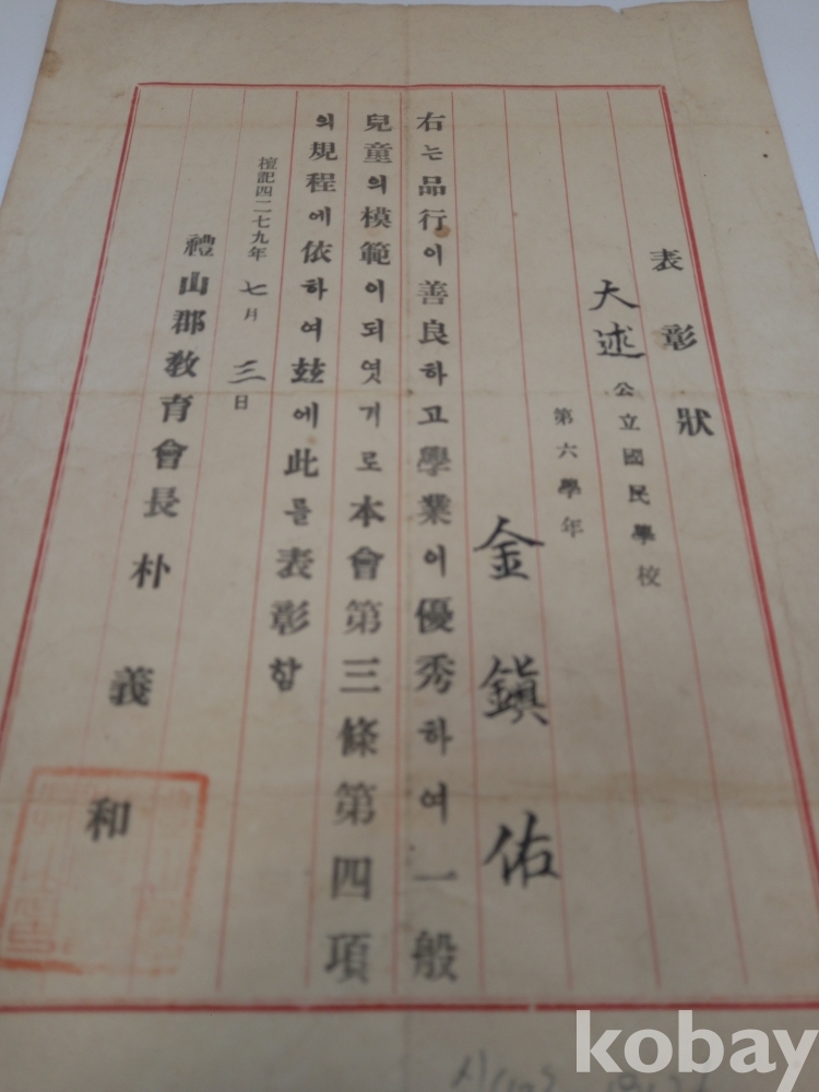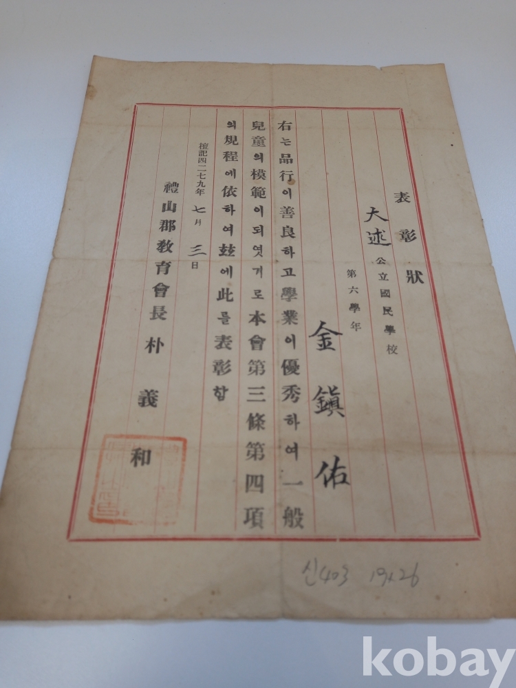 신 403) 예산군 교육회 표창장