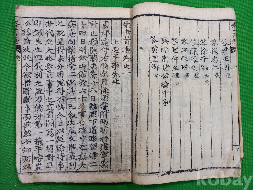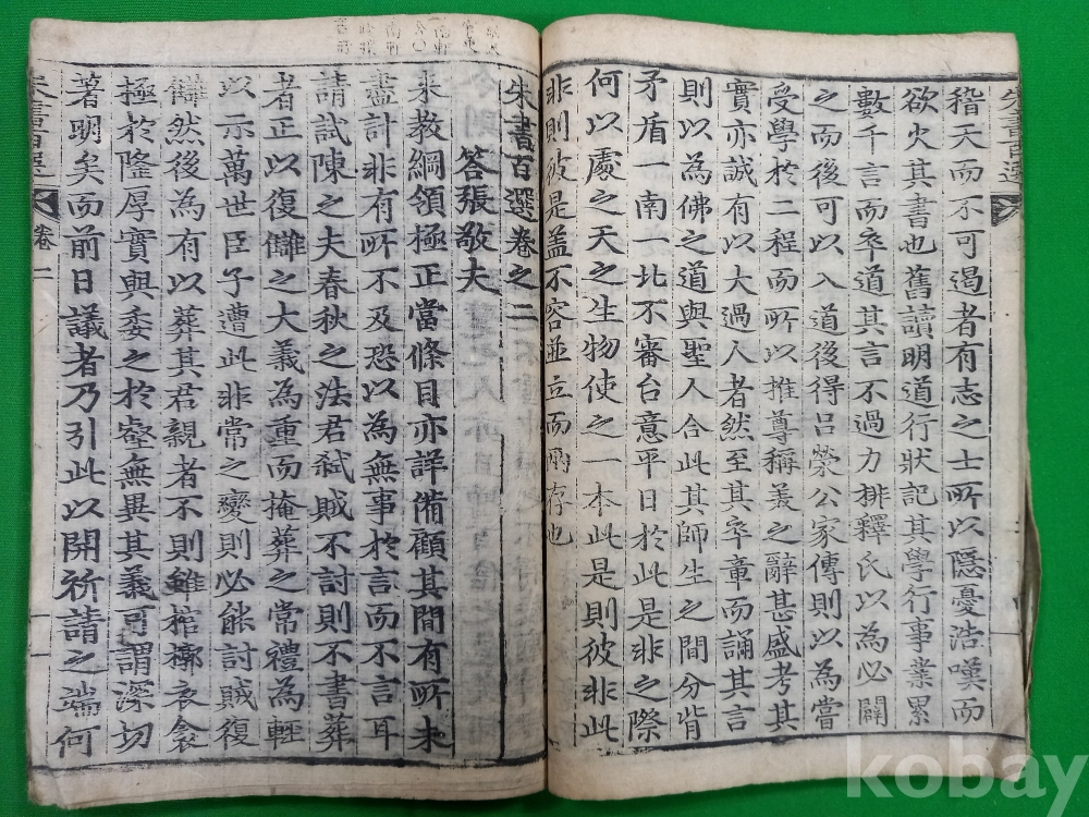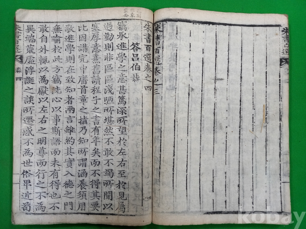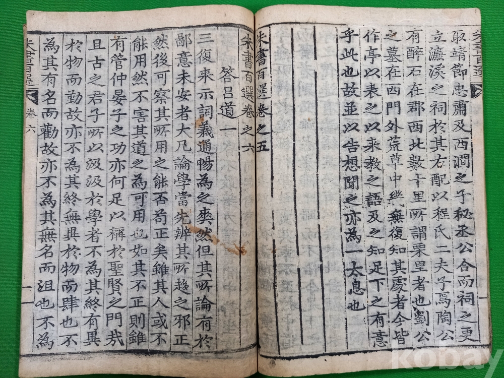 이 고서는 조선 후기 정조(正祖) 임금이 직접 주희의 편지 100편을 선정해 엮은『주서백선(朱書百選)』입니다. 본래 글은 송나라의 주희(朱熹)가 쓴 편지들이며, 조선의 정조가 학술 진흥을 위해 그중 요긴한 100편을 직접 골라 1794년(정조 18년)에 편찬했습니다. 성리학의 대가인 주자가 제자나 동료 학자들과 나눈 편지글을 통해 그의 학문적 견해와 사상을 엿볼 수 있는 귀중한 자료입니다