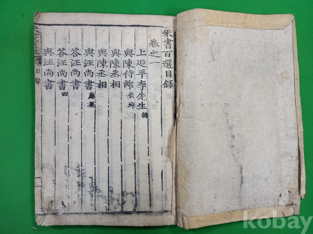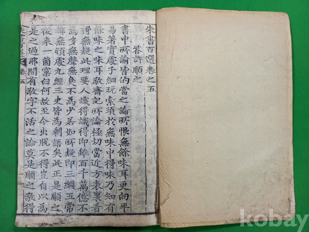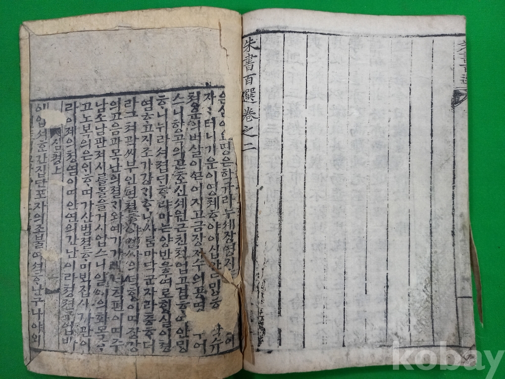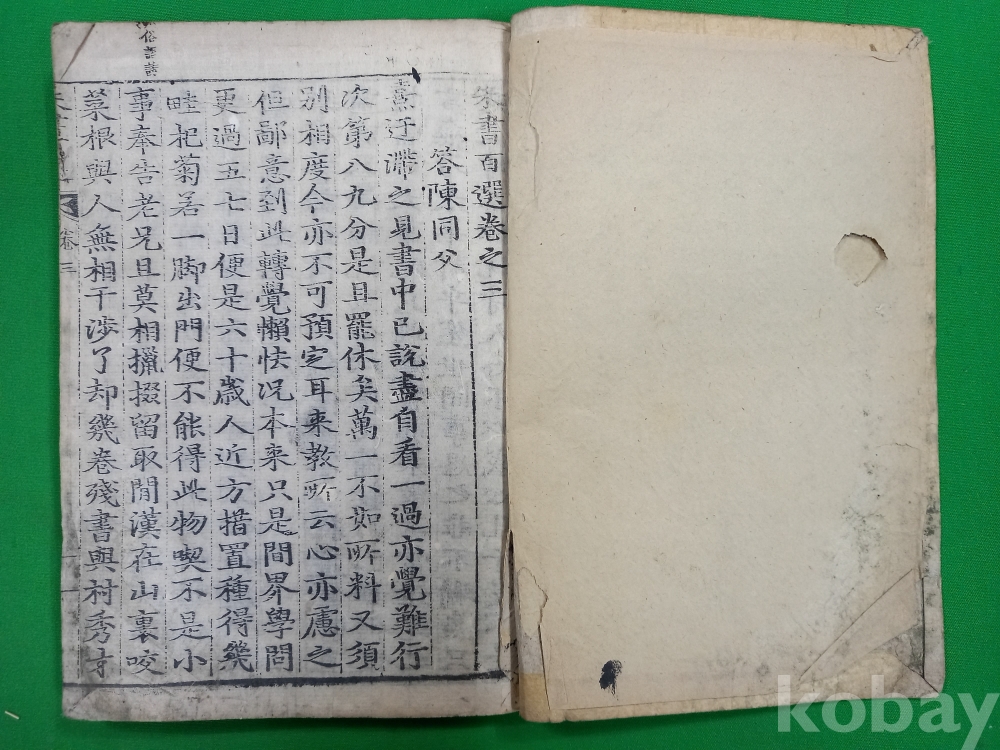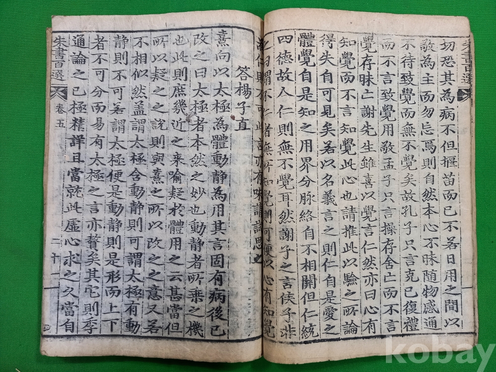 이 고서는 조선 후기 정조(正祖) 임금이 직접 주희의 편지 100편을 선정해 엮은『주서백선(朱書百選)』입니다. 본래 글은 송나라의 주희(朱熹)가 쓴 편지들이며, 조선의 정조가 학술 진흥을 위해 그중 요긴한 100편을 직접 골라 1794년(정조 18년)에 편찬했습니다. 성리학의 대가인 주자가 제자나 동료 학자들과 나눈 편지글을 통해 그의 학문적 견해와 사상을 엿볼 수 있는 귀중한 자료입니다
