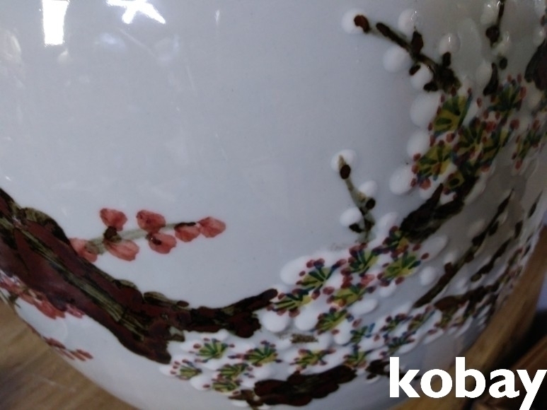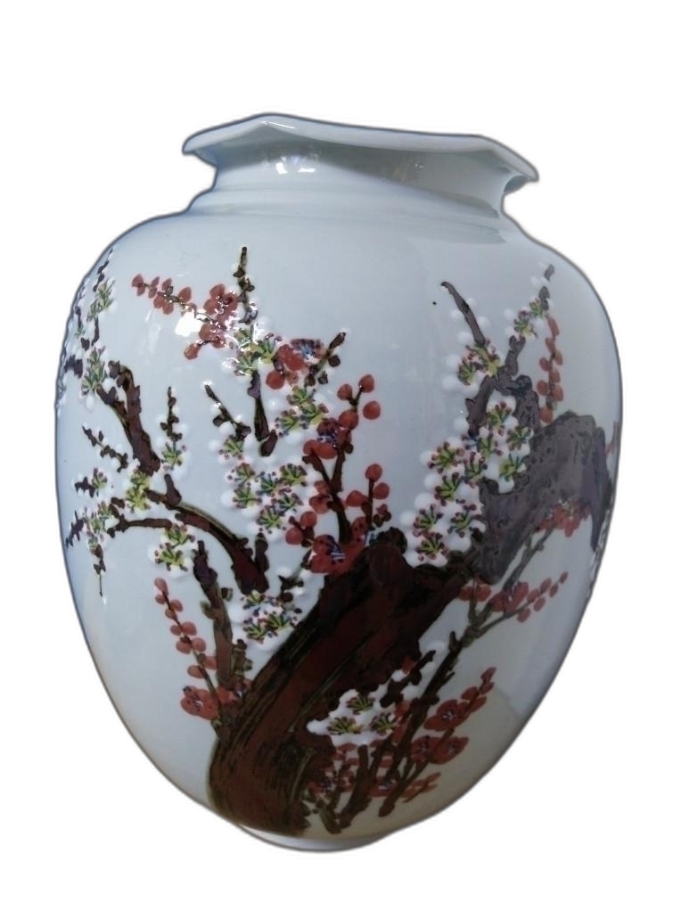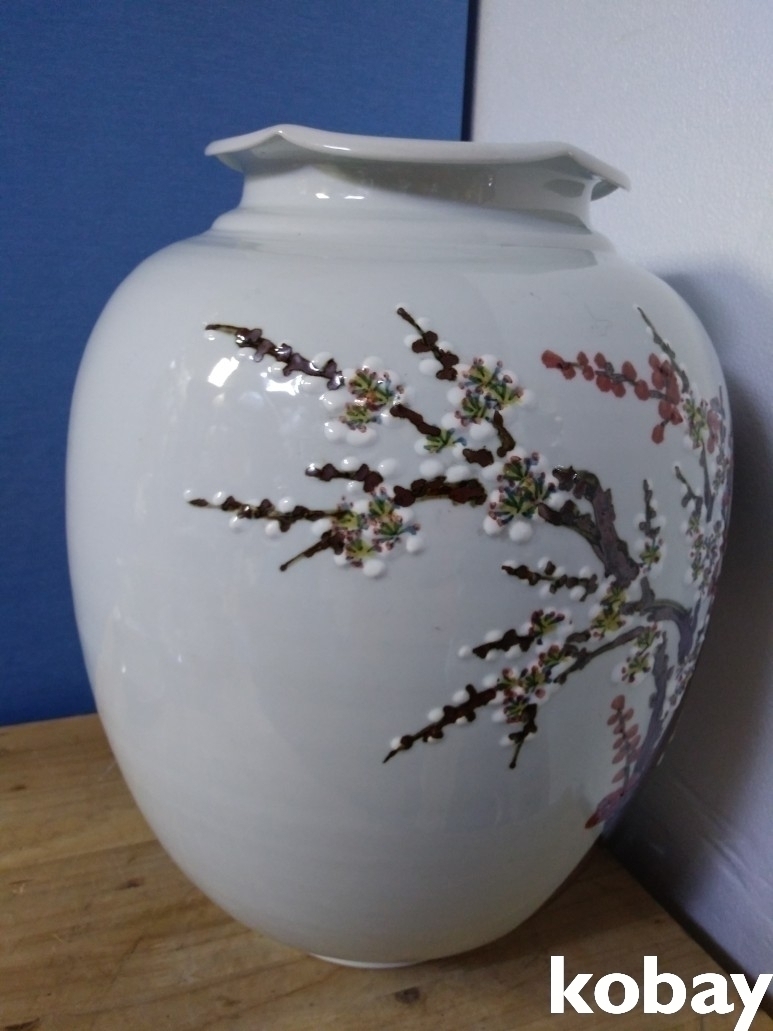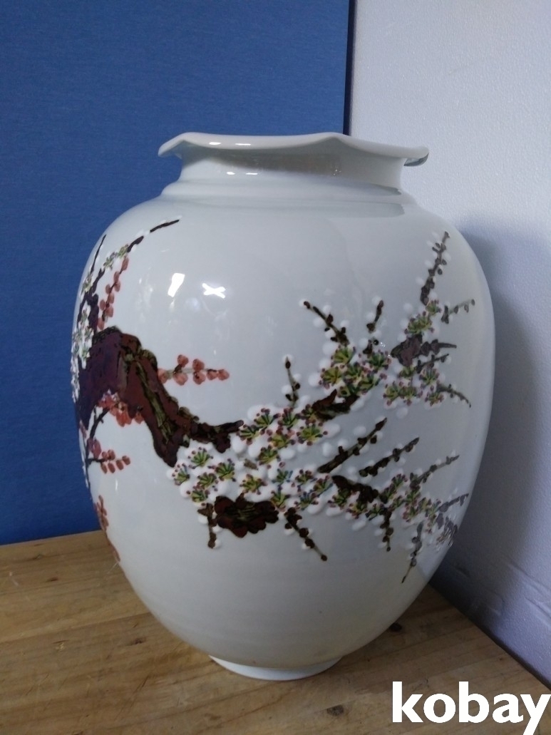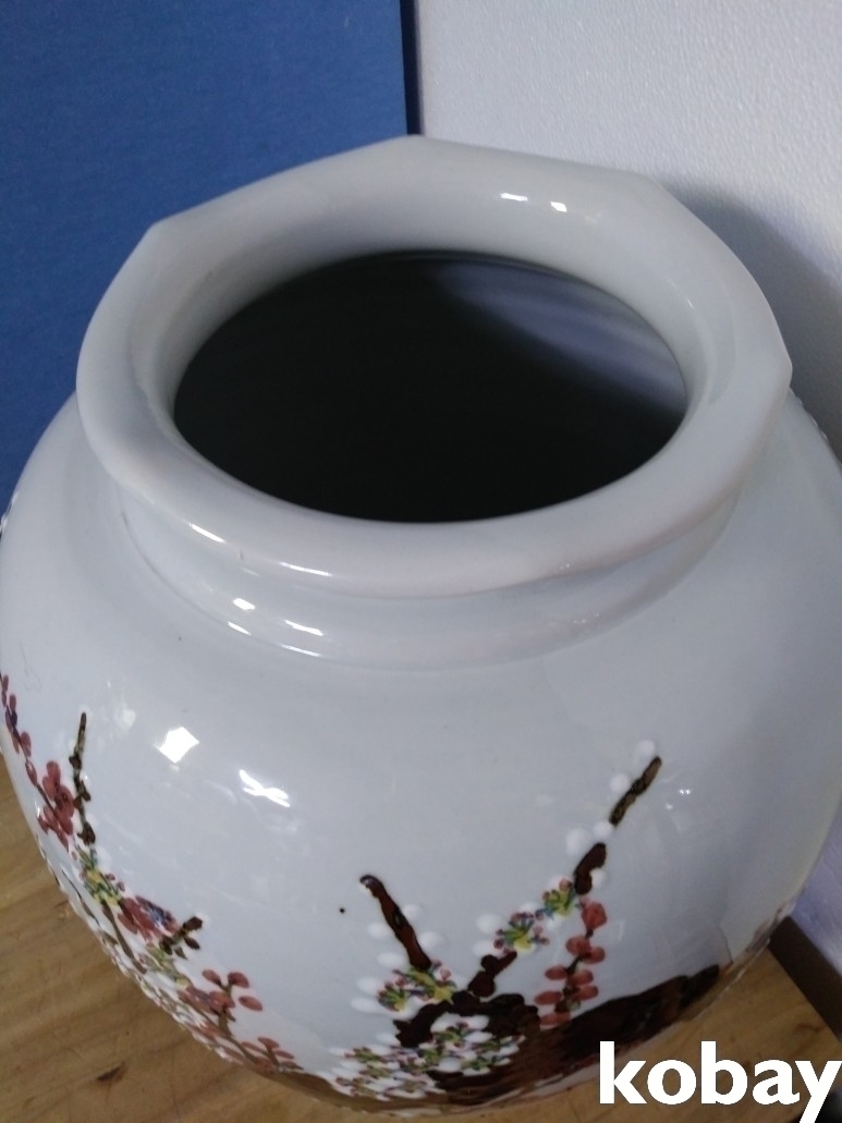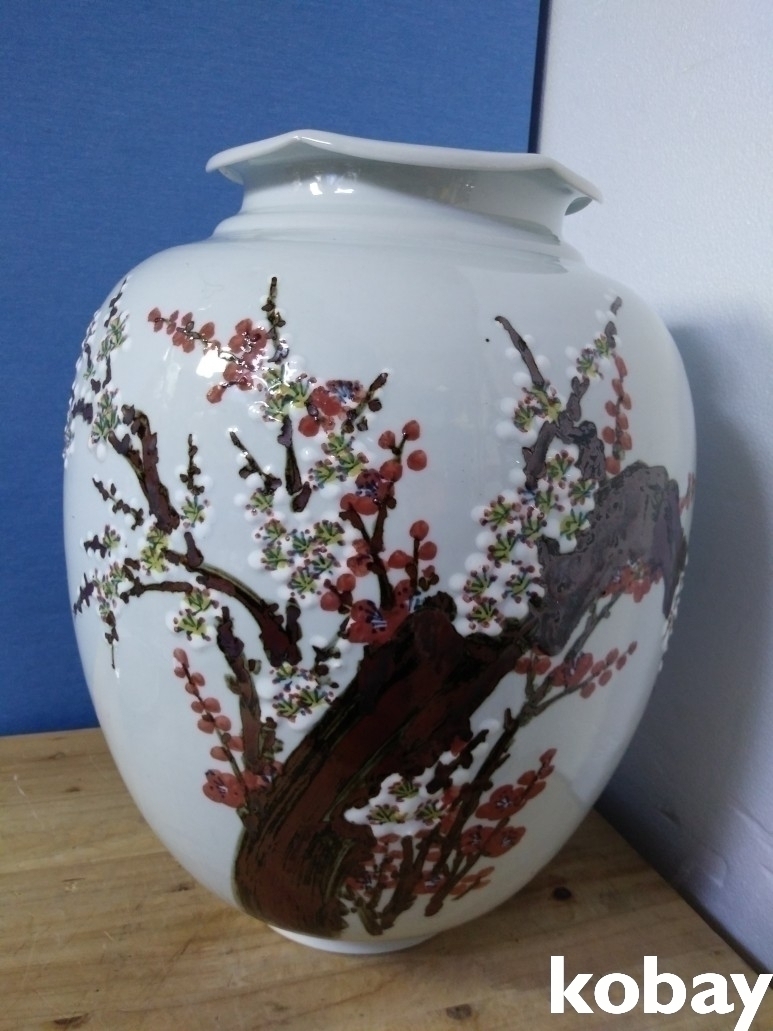 철화로 매화 꽃 문양이 양각으로 있는 도자기 입니다.