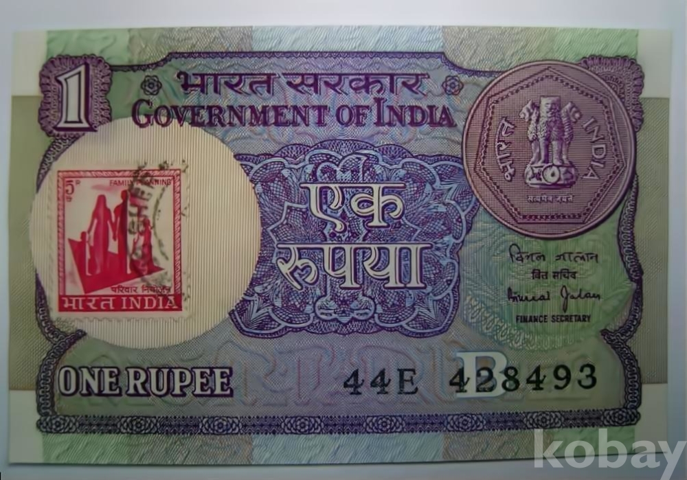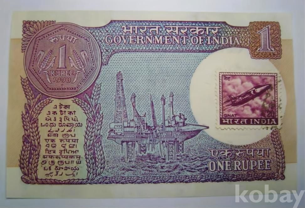 우표가 있는 지폐 인도 1루피 1990년(UNC)