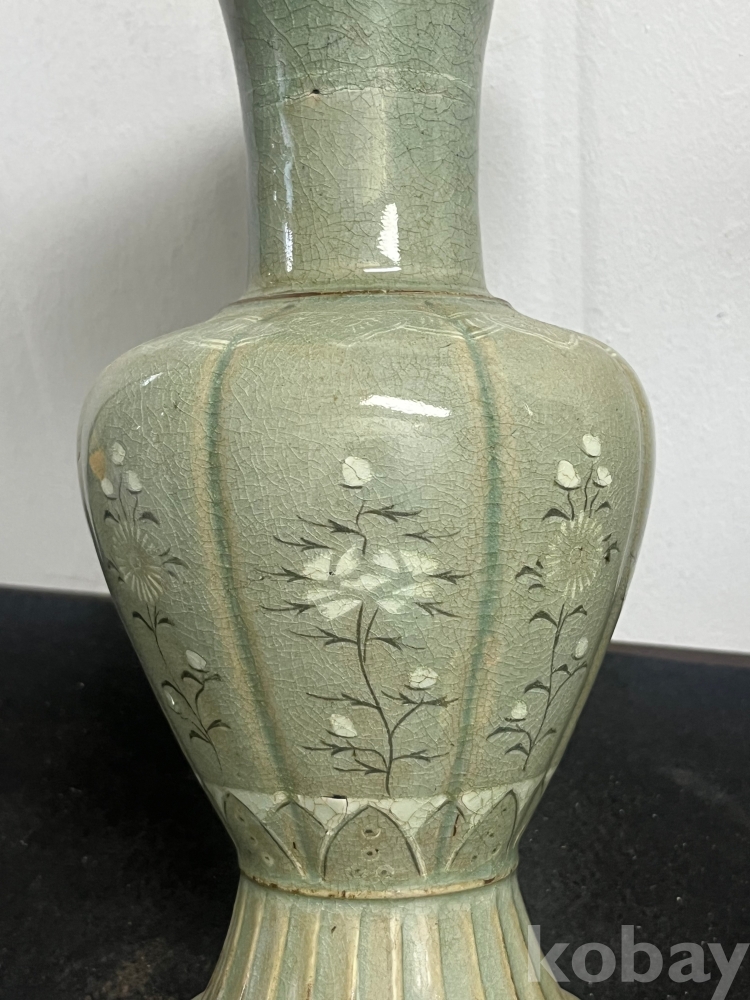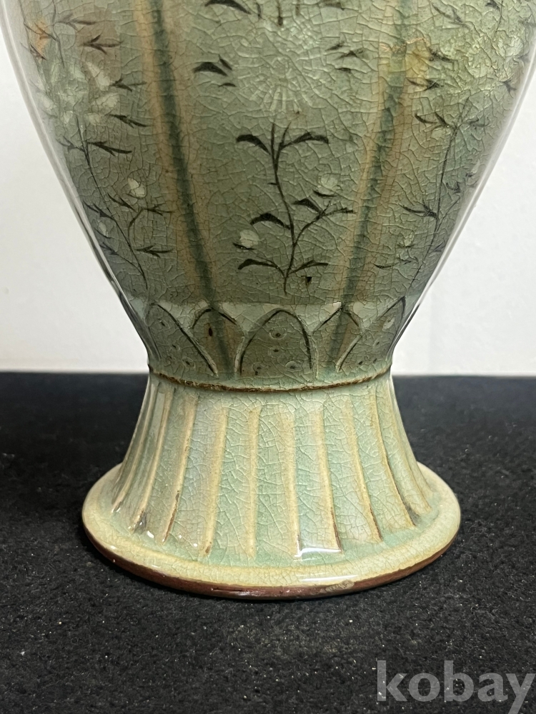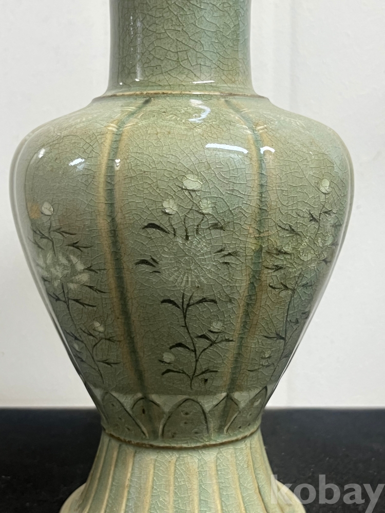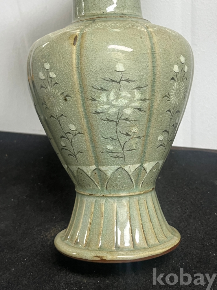 유려한 곡선을 지닌 참외형 기형에 은은한 청자 유색이 어우러진 화훼문 병입니다.
