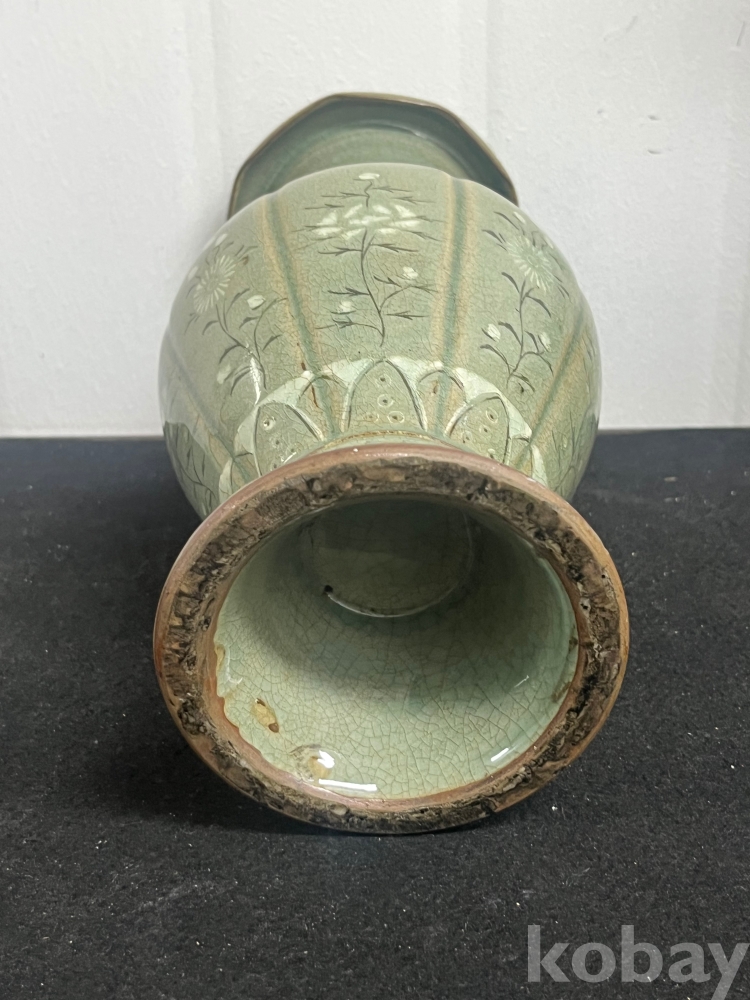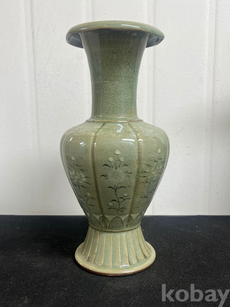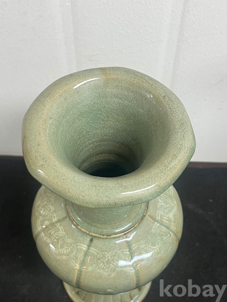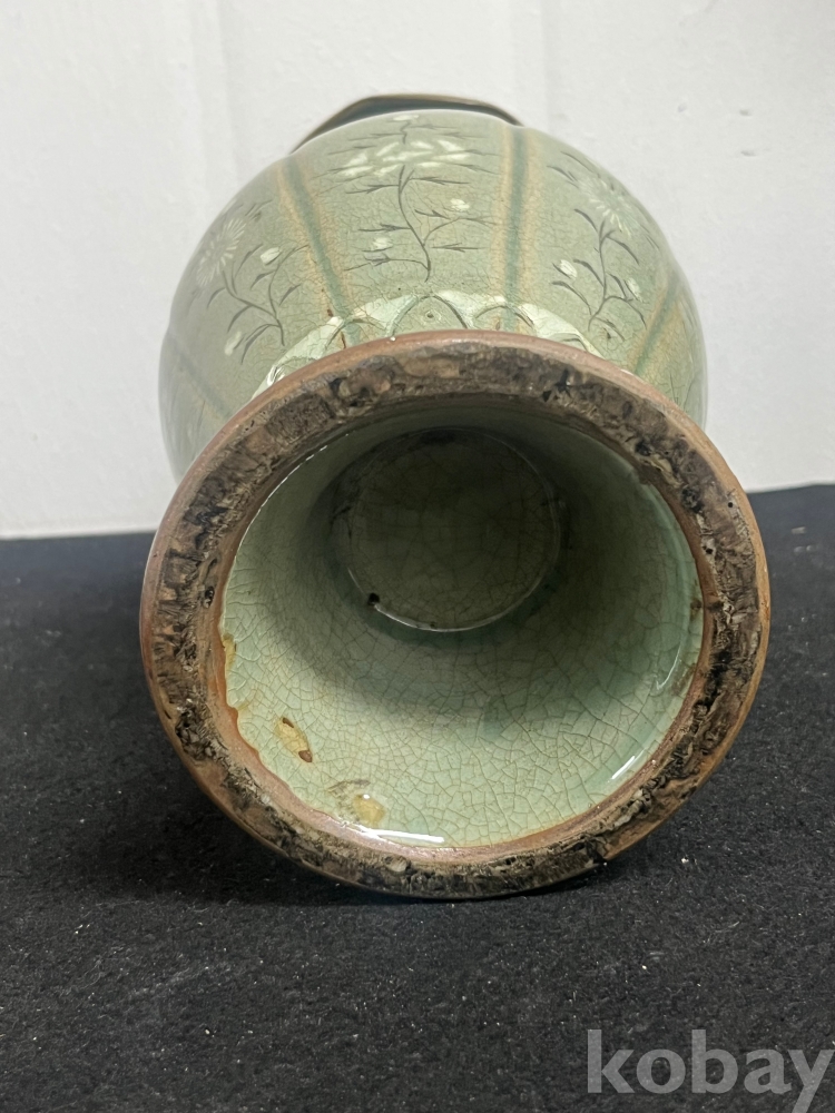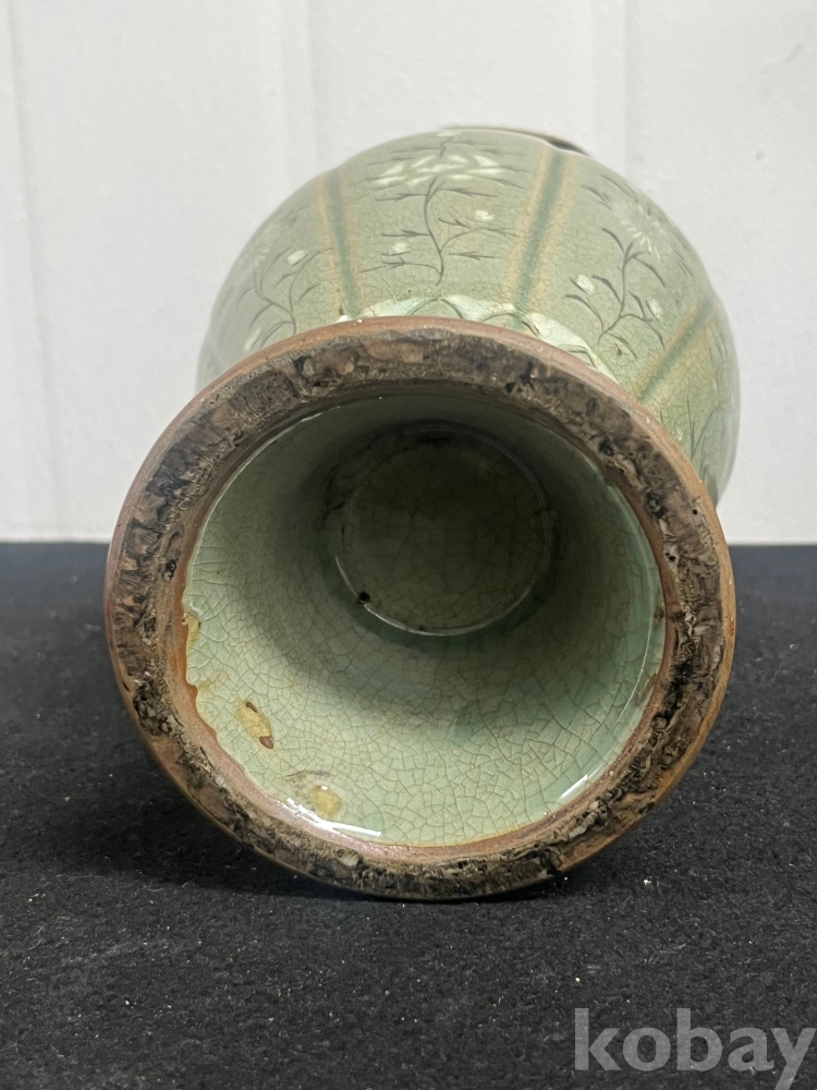 유려한 곡선을 지닌 참외형 기형에 은은한 청자 유색이 어우러진 화훼문 병입니다.