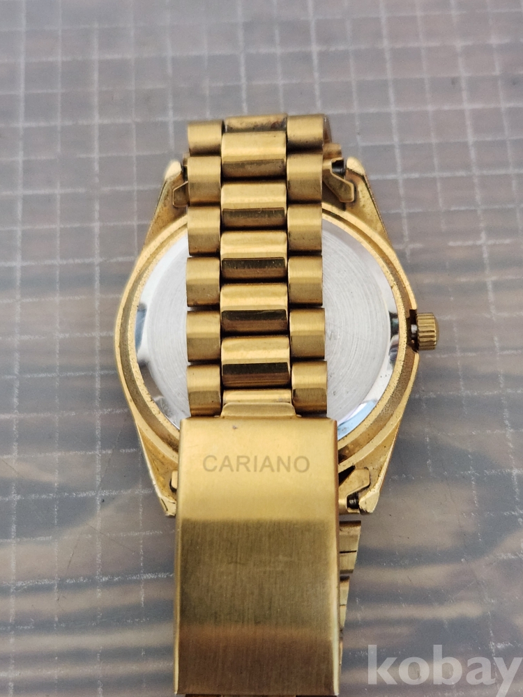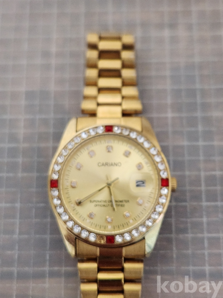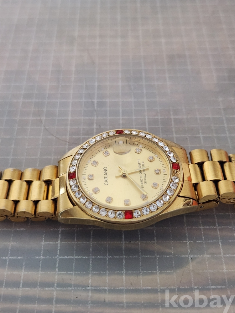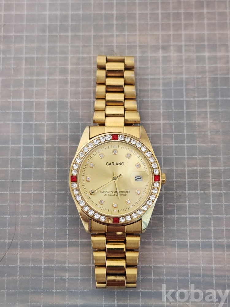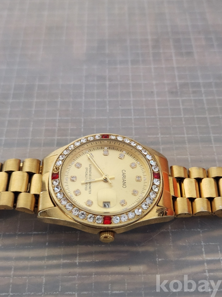 (땡처리) 카리아노 브랜드의 금장 손목시계입니다. 베젤에 큐빅 장식이 있어 더욱 돋보이며, 날짜 표시 기능도 갖추고 있습니다. 스테인리스 스틸 백으로 제작되었습니다. (모델명: H-1012M)