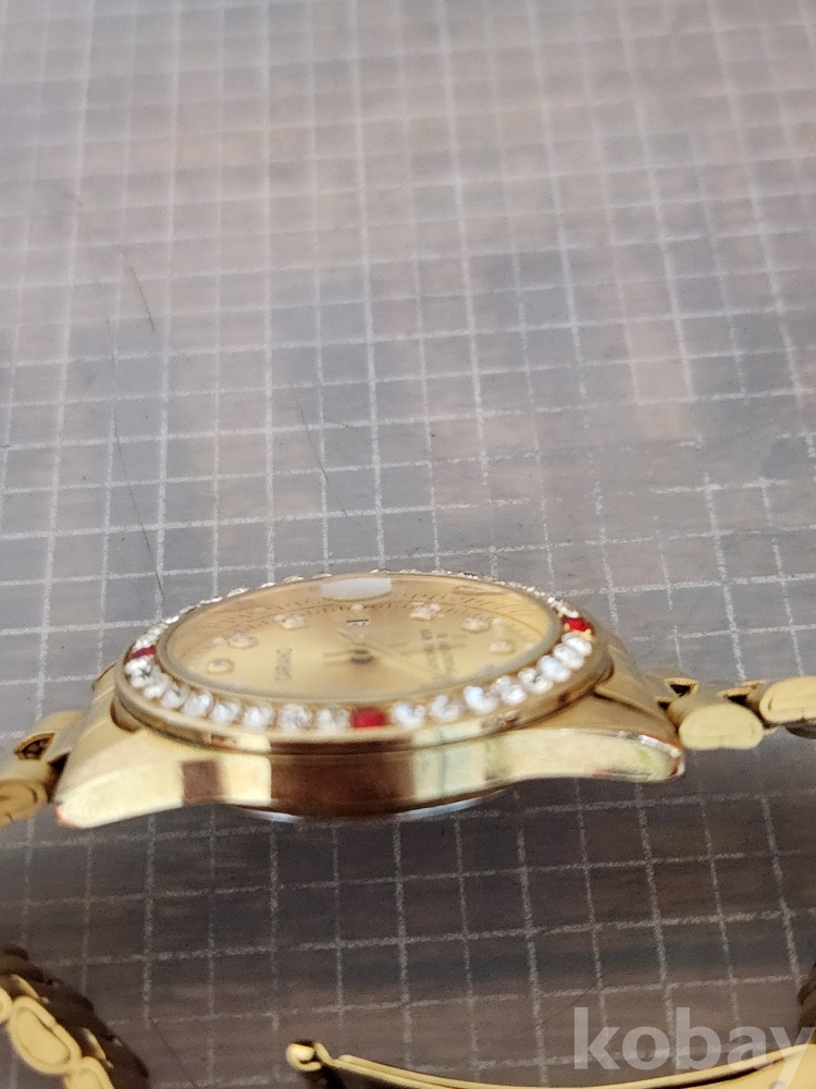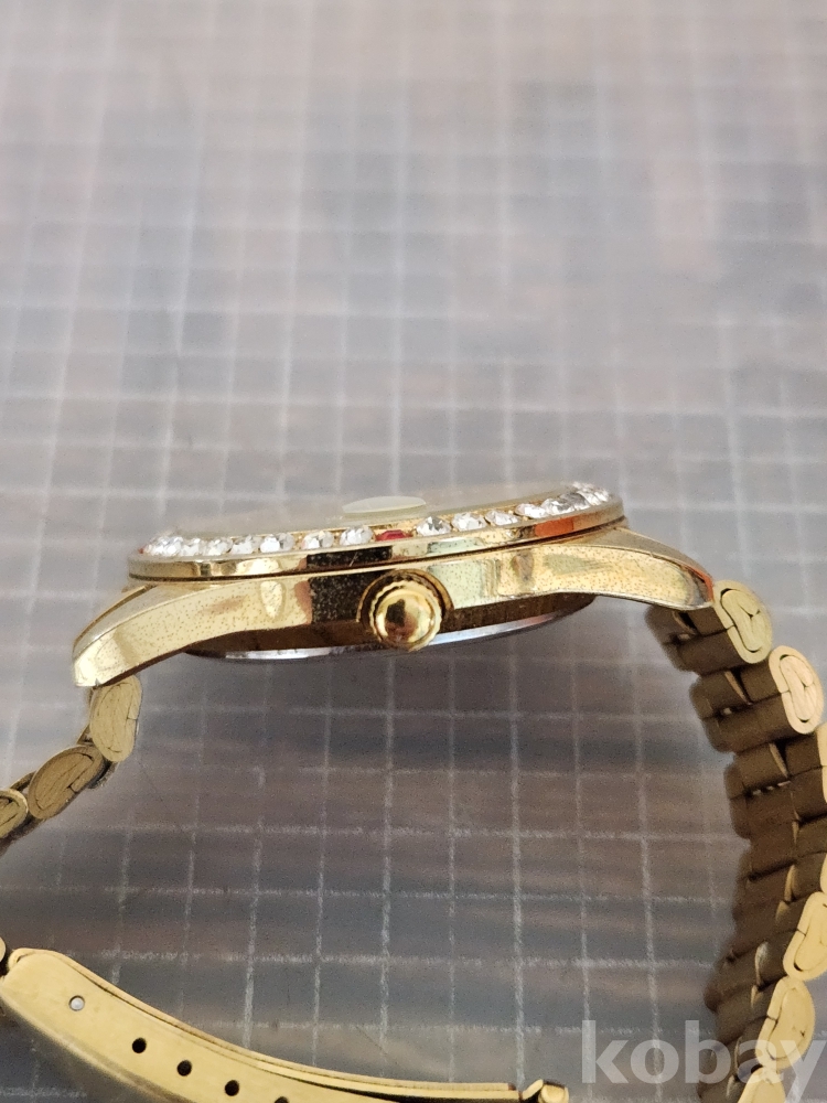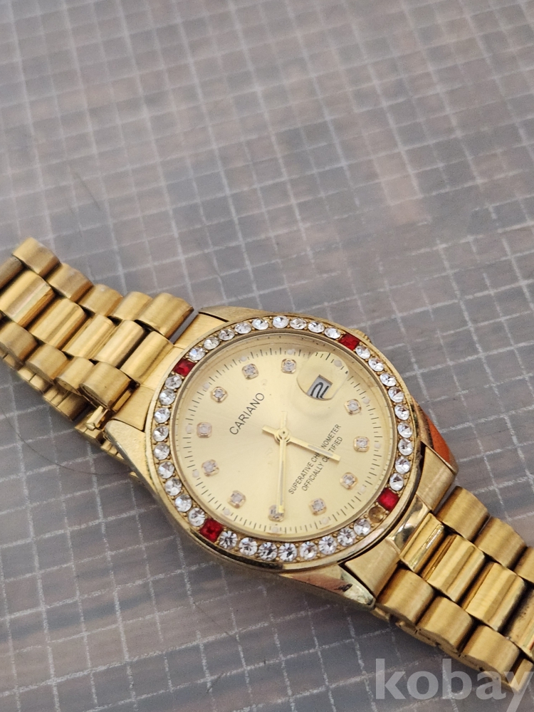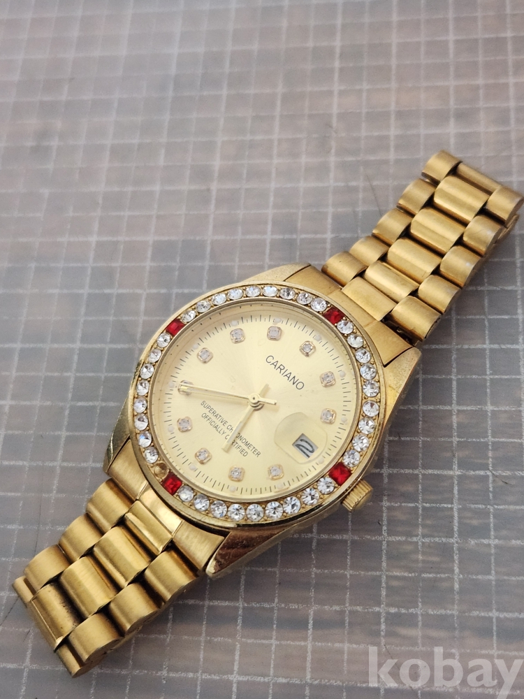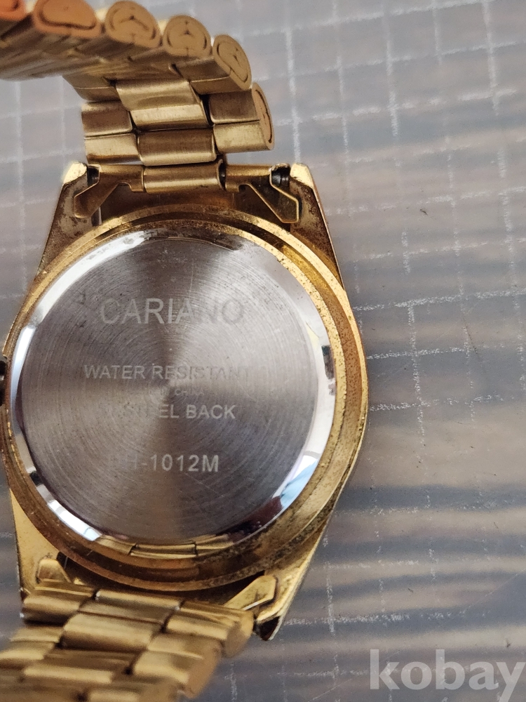 (땡처리) 카리아노 브랜드의 금장 손목시계입니다. 베젤에 큐빅 장식이 있어 더욱 돋보이며, 날짜 표시 기능도 갖추고 있습니다. 스테인리스 스틸 백으로 제작되었습니다. (모델명: H-1012M)