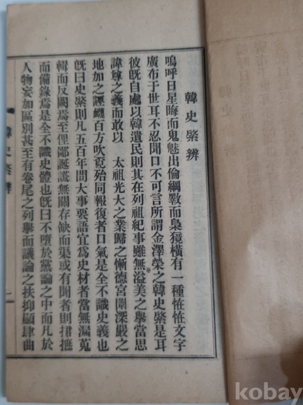 1924년에 맹보순이 1918년 金澤榮이 간행한 『韓史綮』의 내용에 대해 반론을 제시한 글로 신연활자로 인쇄하였고, 본문은 四周雙邊, 無界, 上內向黑魚尾, 10行23字의 형식이다. 書眉에 綮辨의 날짜를 干支로 기록하였다. 본문 마지막 장에 1924년에 京城의 儒林總部에서 발행하고, 京城의 大東印刷株式會社에서 인쇄했다.