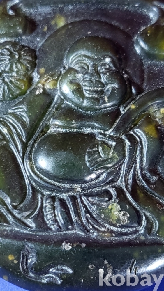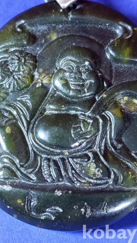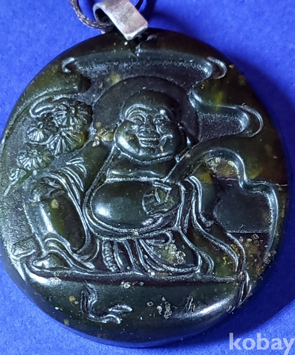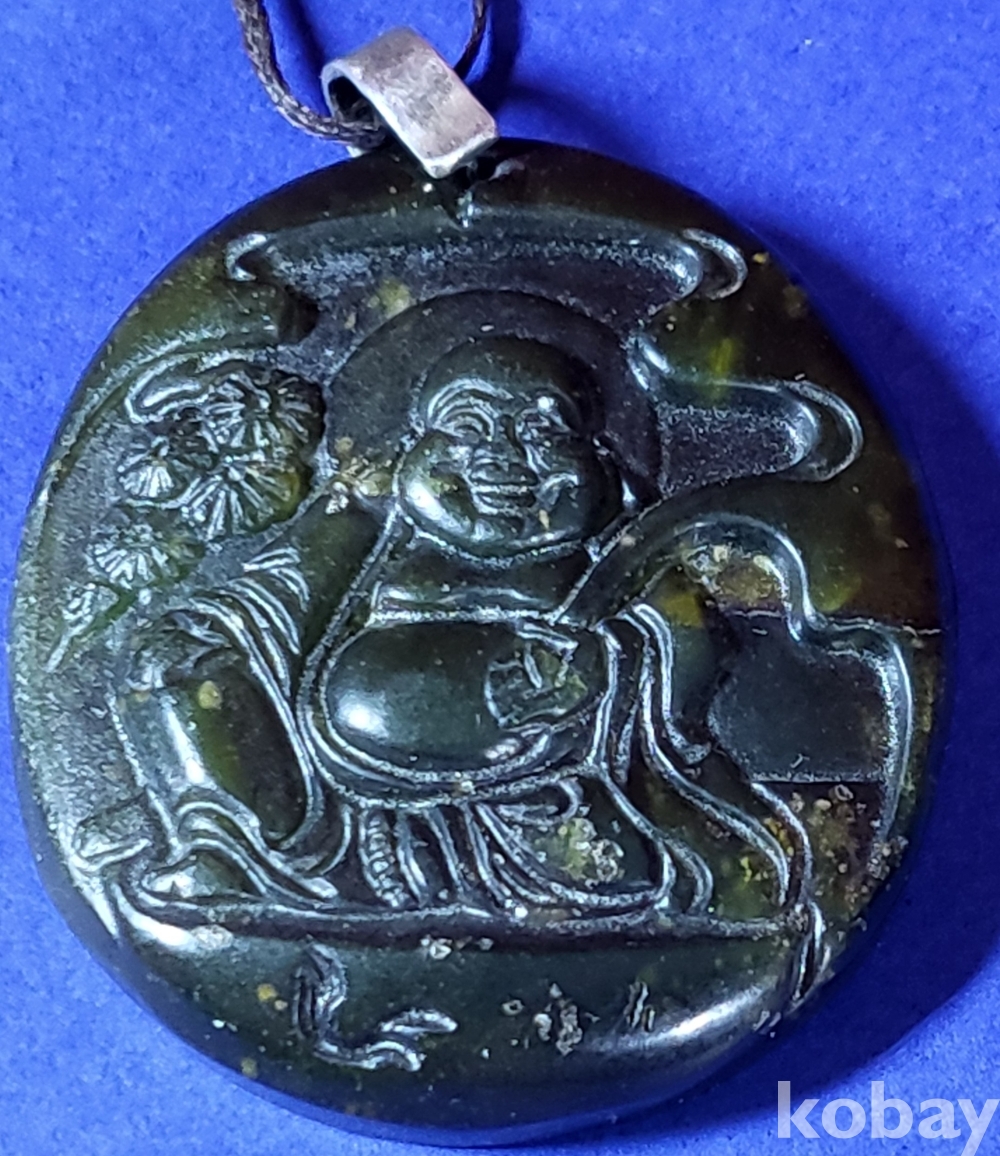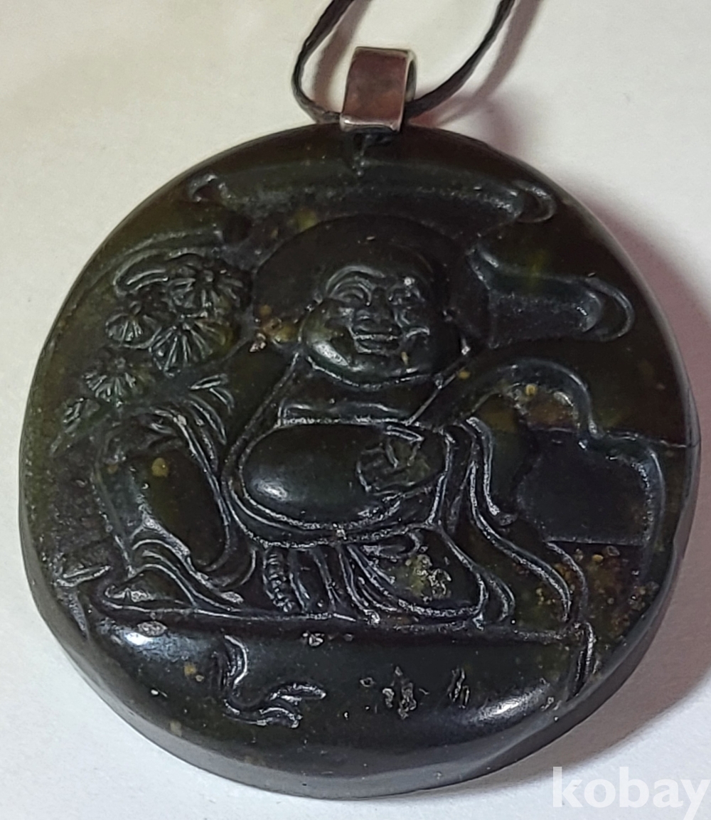 흑요석 (黑曜石)으로 조각된 포대화상(布袋和尙) 은(銀)고리가 장식된 팬던트입니다,