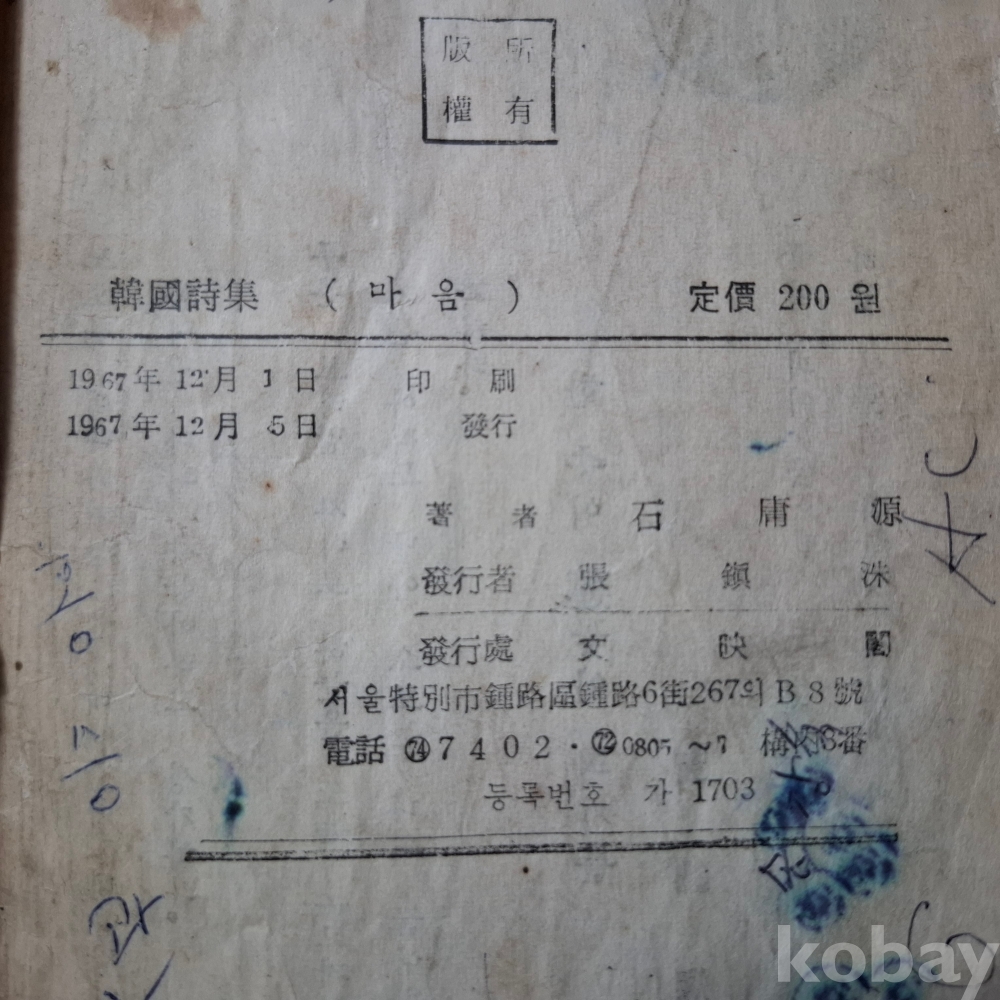 1967년(초판). 마음(한국명시86인선집).석용원.문영각.181쪽