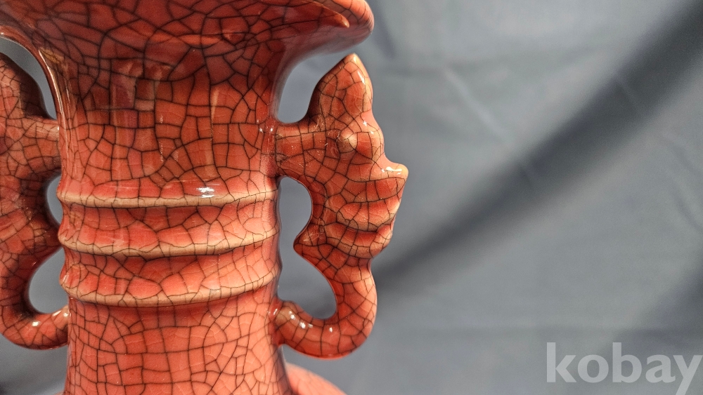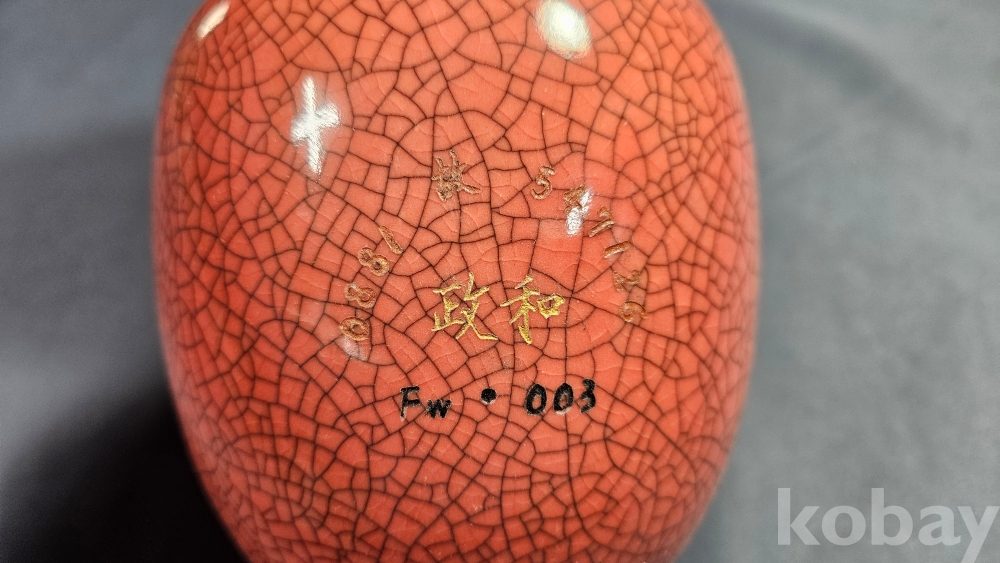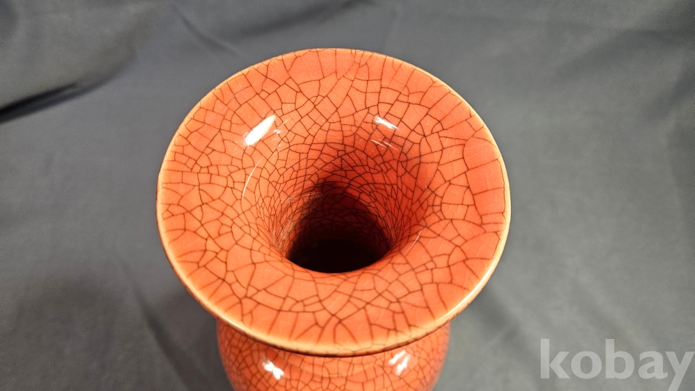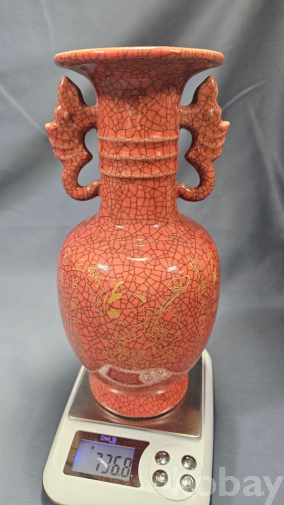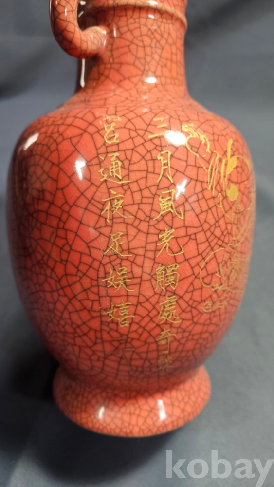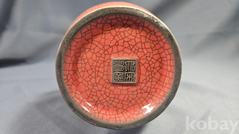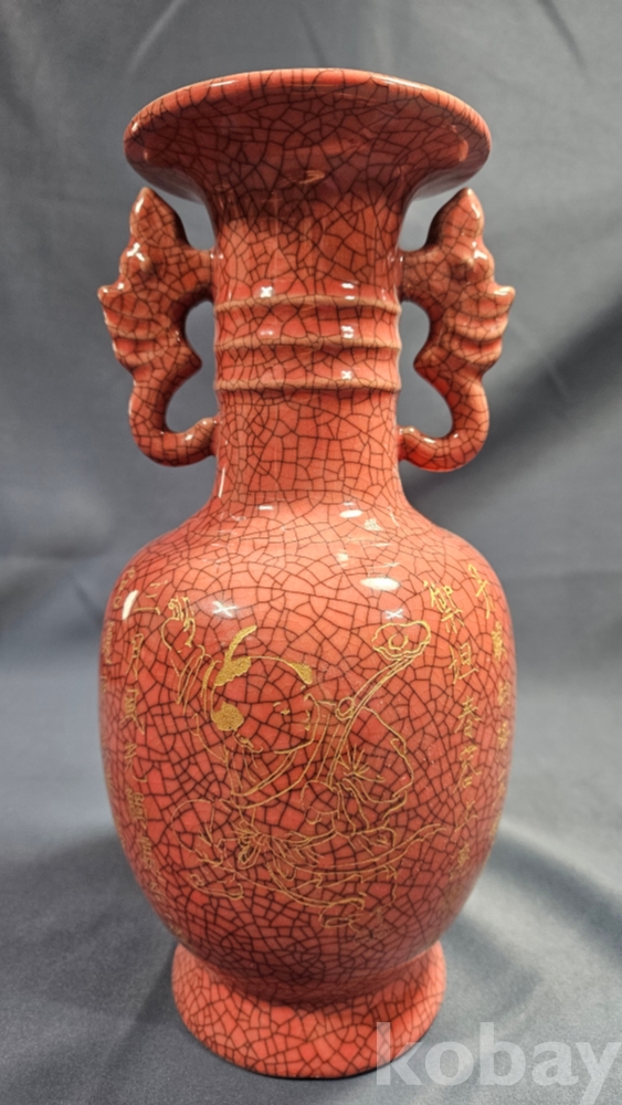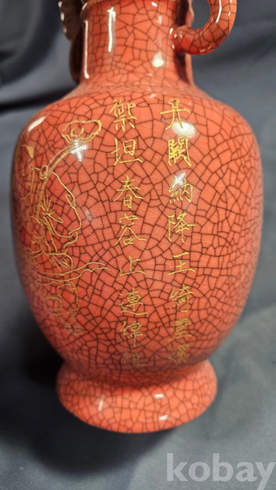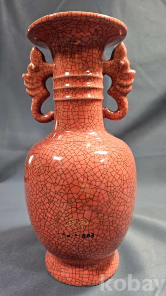 동자와 양쪽으로 글귀가 음각으로 들어있는 붉은색 도자기 화병입니다.