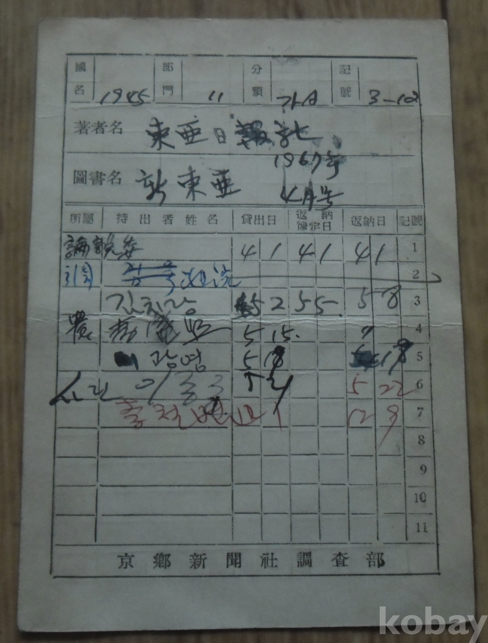 1967년 경향신문사 도서대출 카드