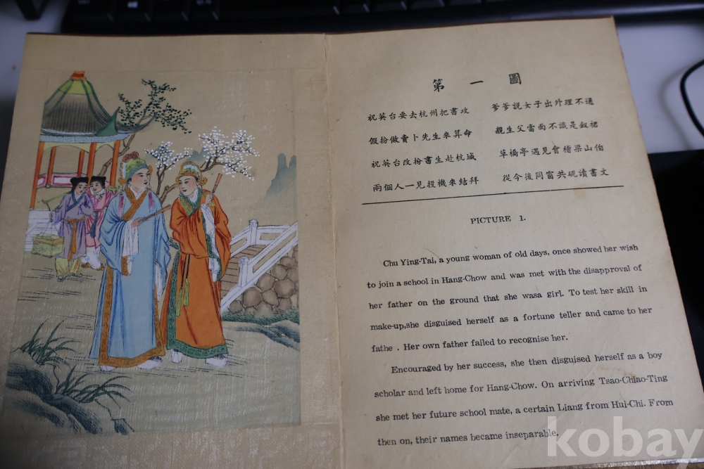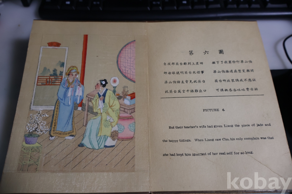 10장면의 비단 그림을 가진 청말기 중국의 문화를 알기기 위한 명저 임니다 열장면의 그림과 영어 한문으로 구성된 극히 귀한 명저 이며 축영대 양산박의 사랑이야기 임니다 나무판을 표지로 만든 대단한 고미술 임니다