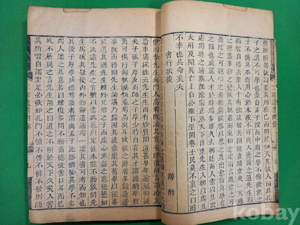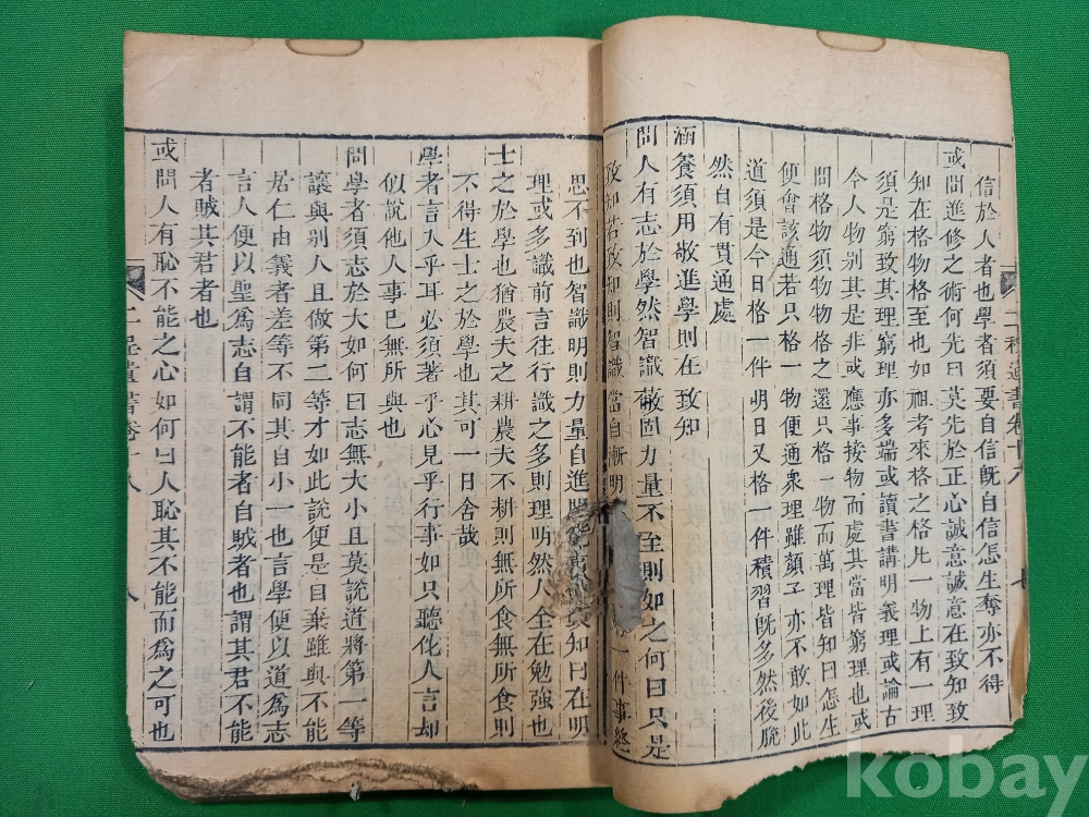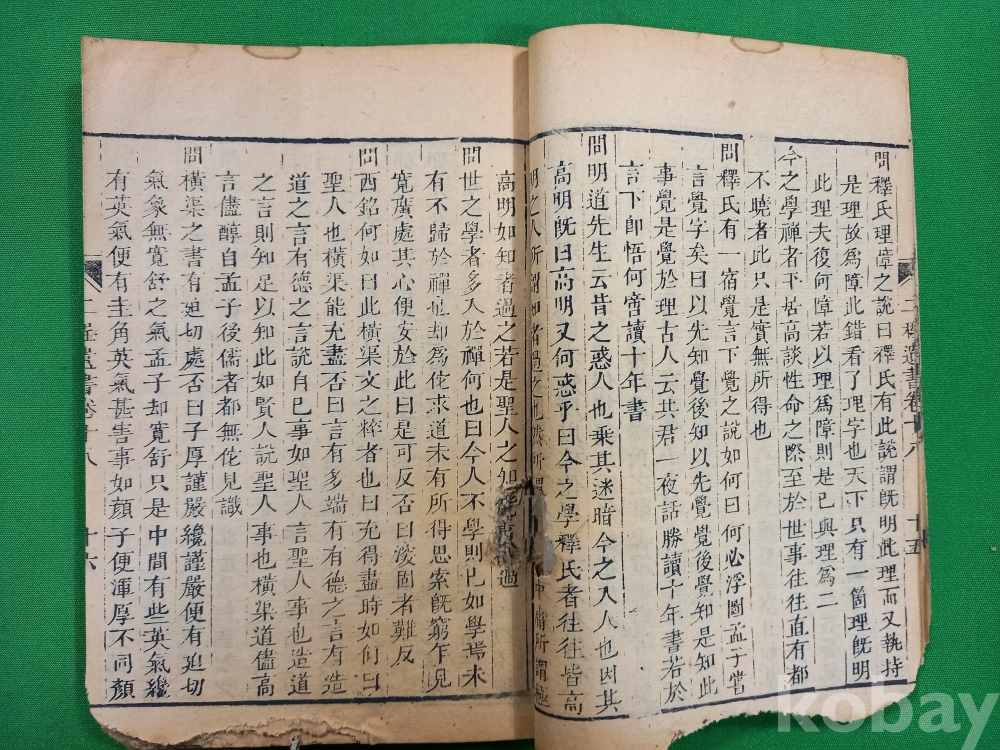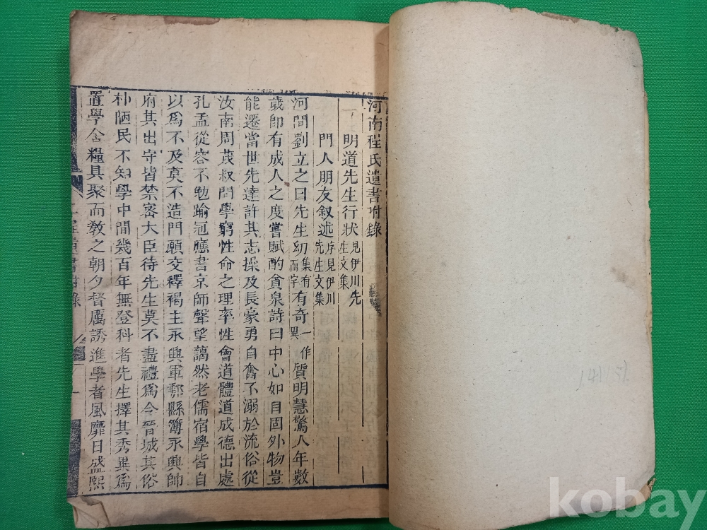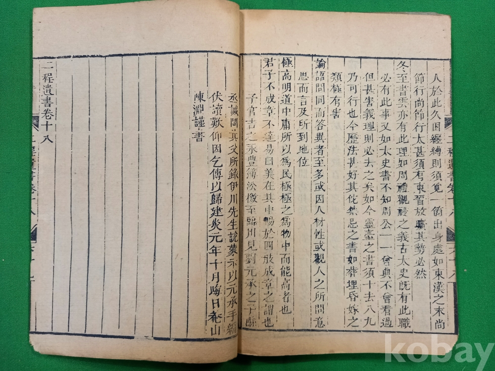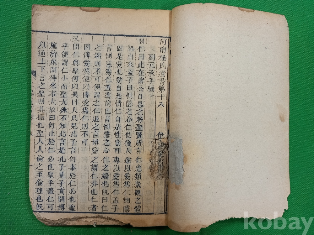이 책은 중국 송나라 시대의 유학자인 정호(程顥)와 정이(程頤) 형제의 가르침을 모은 『하남정씨유서(河南程氏遺書)』 제18권입니다. 이 책은 흔히 『이정유서(二程遺書)』로도 불리며, 성리학의 기초를 닦은 '이정(二程)' 선생들의 어록을 주희(朱熹)가 편집하여 간행한 것입니다.이 책은 주자학(성리학)의 핵심 문헌으로, 당시 학자들이 어떻게 삶을 바라보고 도를 구했는지 보여주는 중요한 사료입니다.조선시대 유학자들 사이에서 성리학 연구를 위한 필수적인 텍스트 중 하나로 널리 읽혔던 고전 문헌입니다.