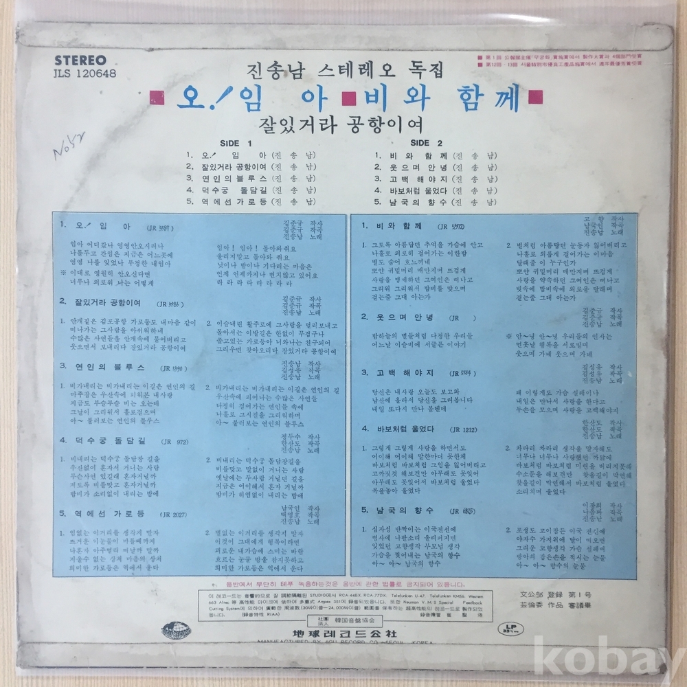 진송남 스테레오독집 - 비와 함께/오!님아