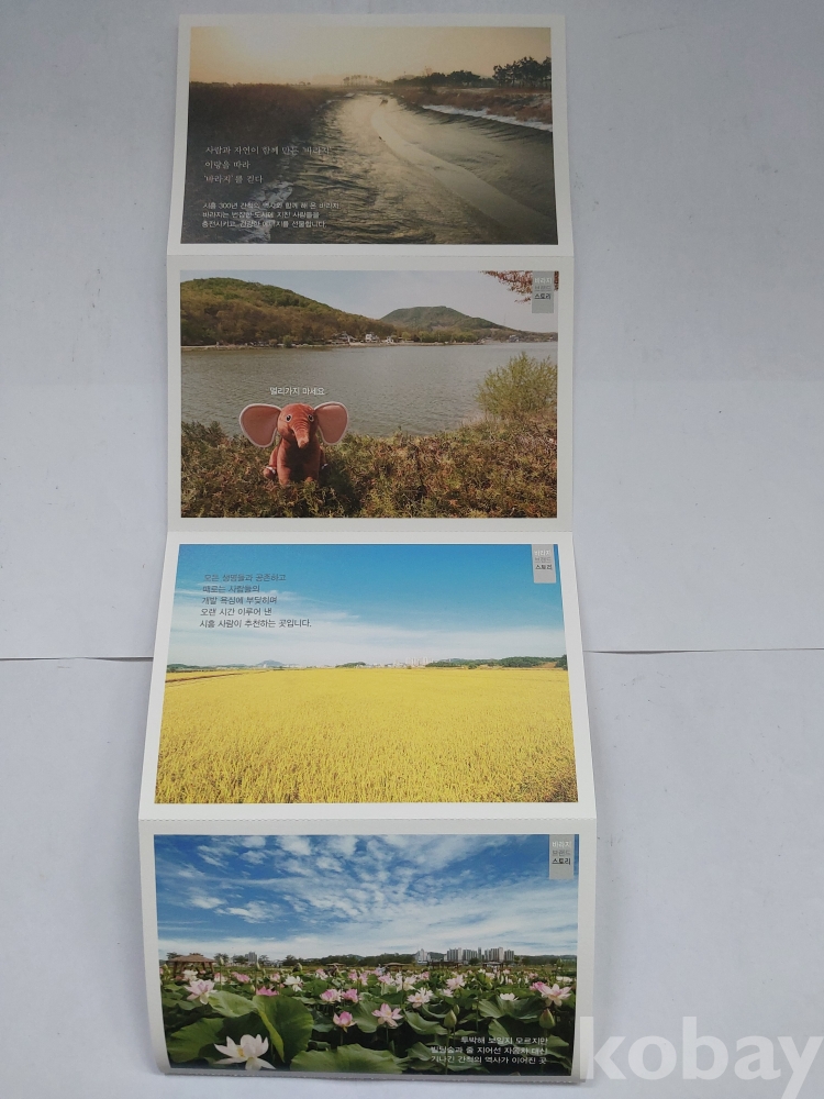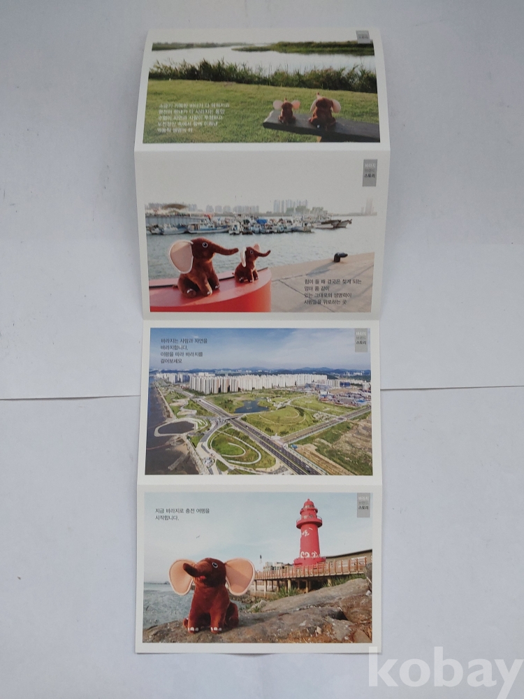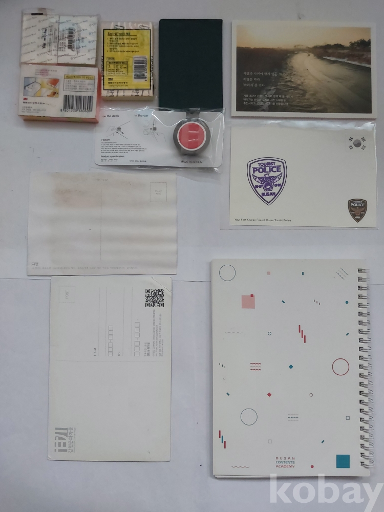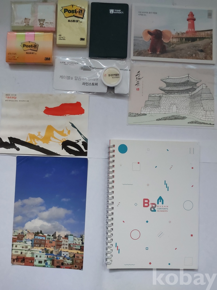 1)포스트 잍 3조, 2)전화메모수첩, 3)라인스토퍼, 4)바라지 엽서 8매, 5)숭례문 엽서, 6)아리랑 엽서, 7)감천문화마을 엽서, 8)메모장