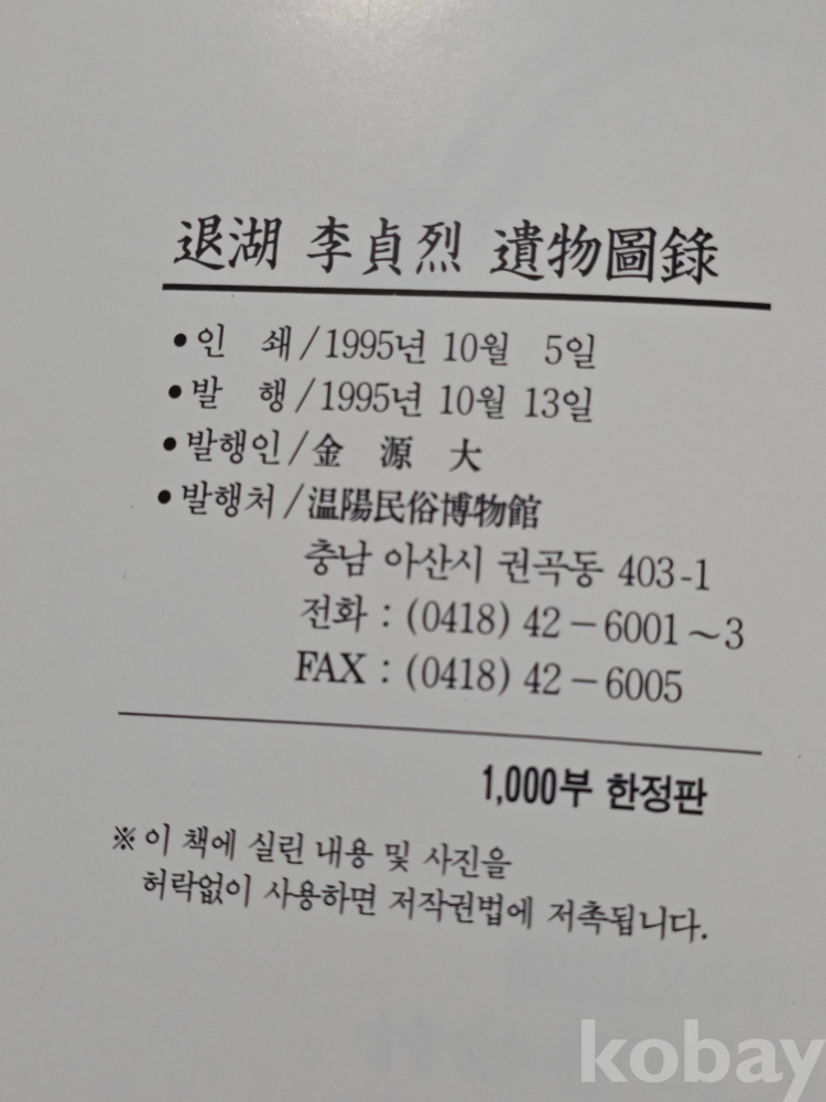 (((서적/도록/圖錄))) 退湖 李貞烈 遺物圖錄 (1995년 발행) (溫陽民俗博物館) (1000부한정)
