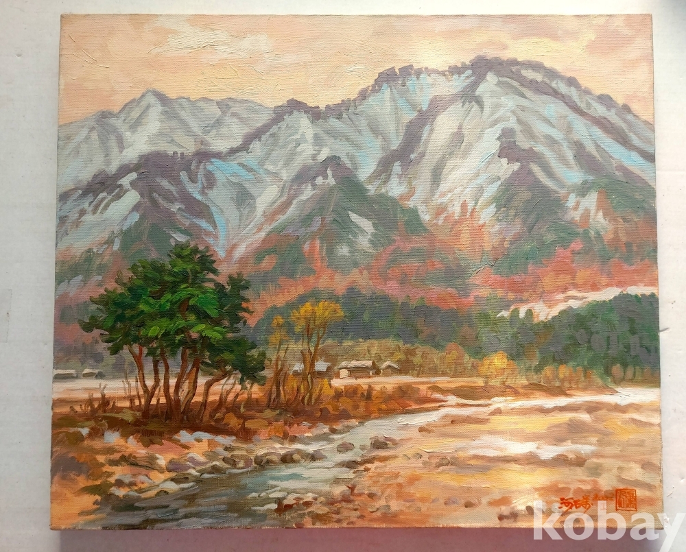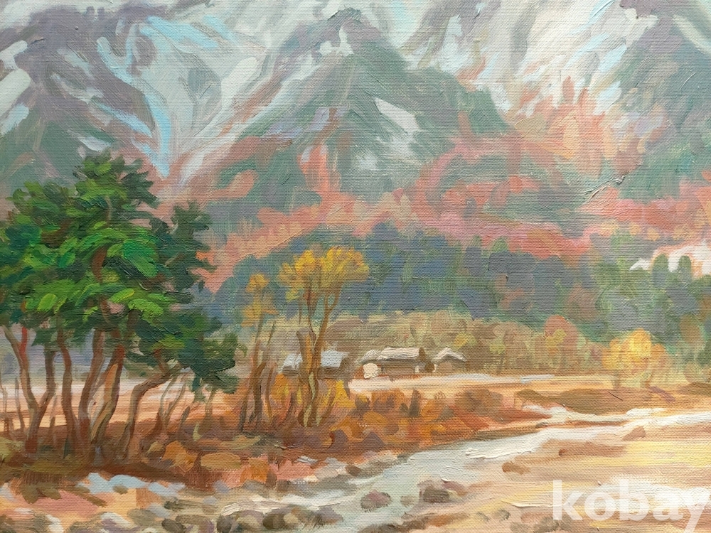작품 설명: 전경에는 물이 흐르는 평지와 나무가 배치돼 있으며, 중경에는 마을과 들판이 이어져 화면을 구성하고 있다. 후경에는 산세가 화면을 크게 차지하며 깊이감을 형성하고 있다. 강원도 화천군 일대 풍경을 바탕으로, 계절 변화에 따른 색채 대비와 자연의 구조가 안정적으로 표현돼 있다.