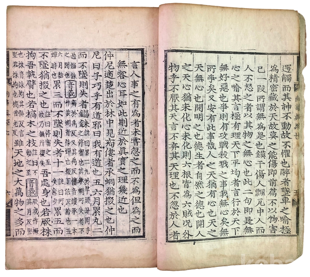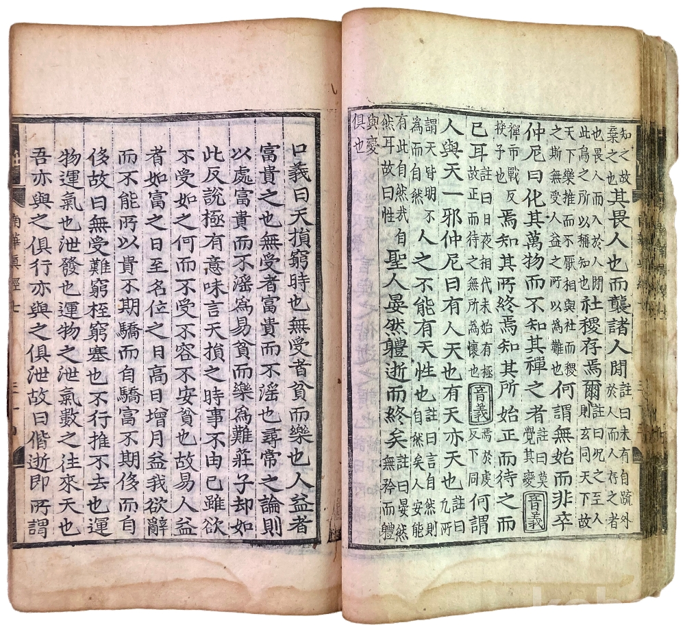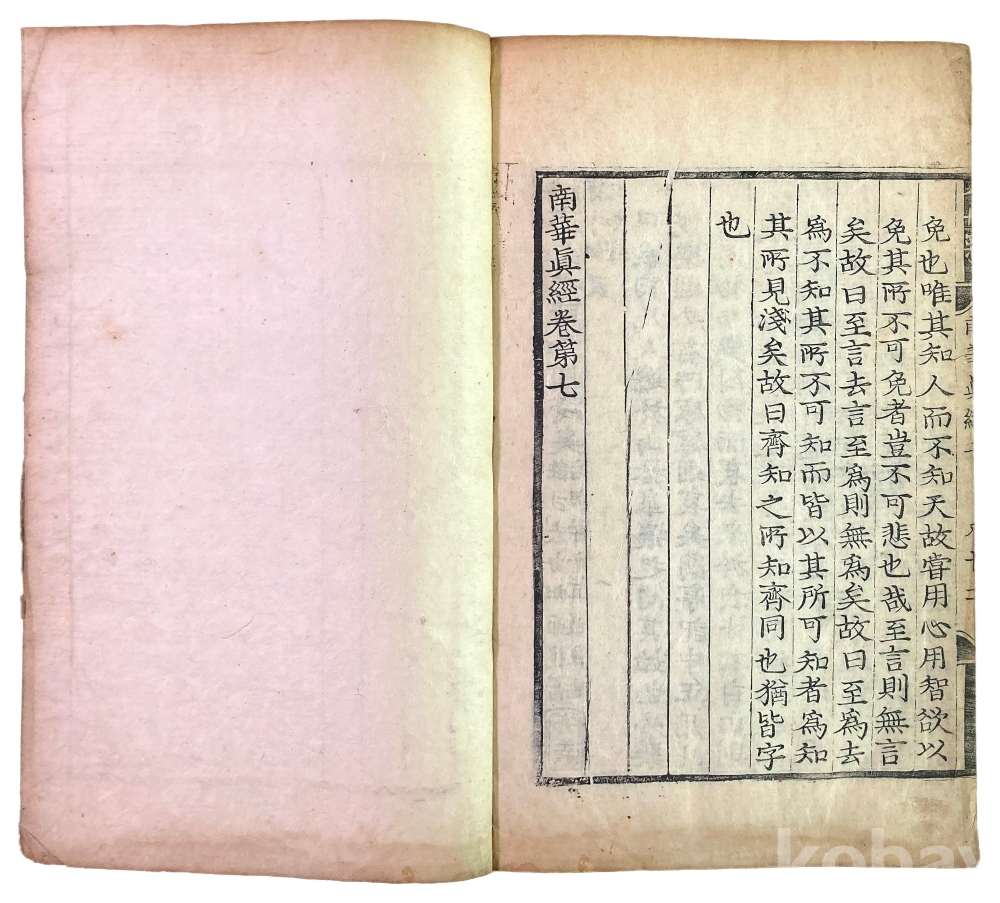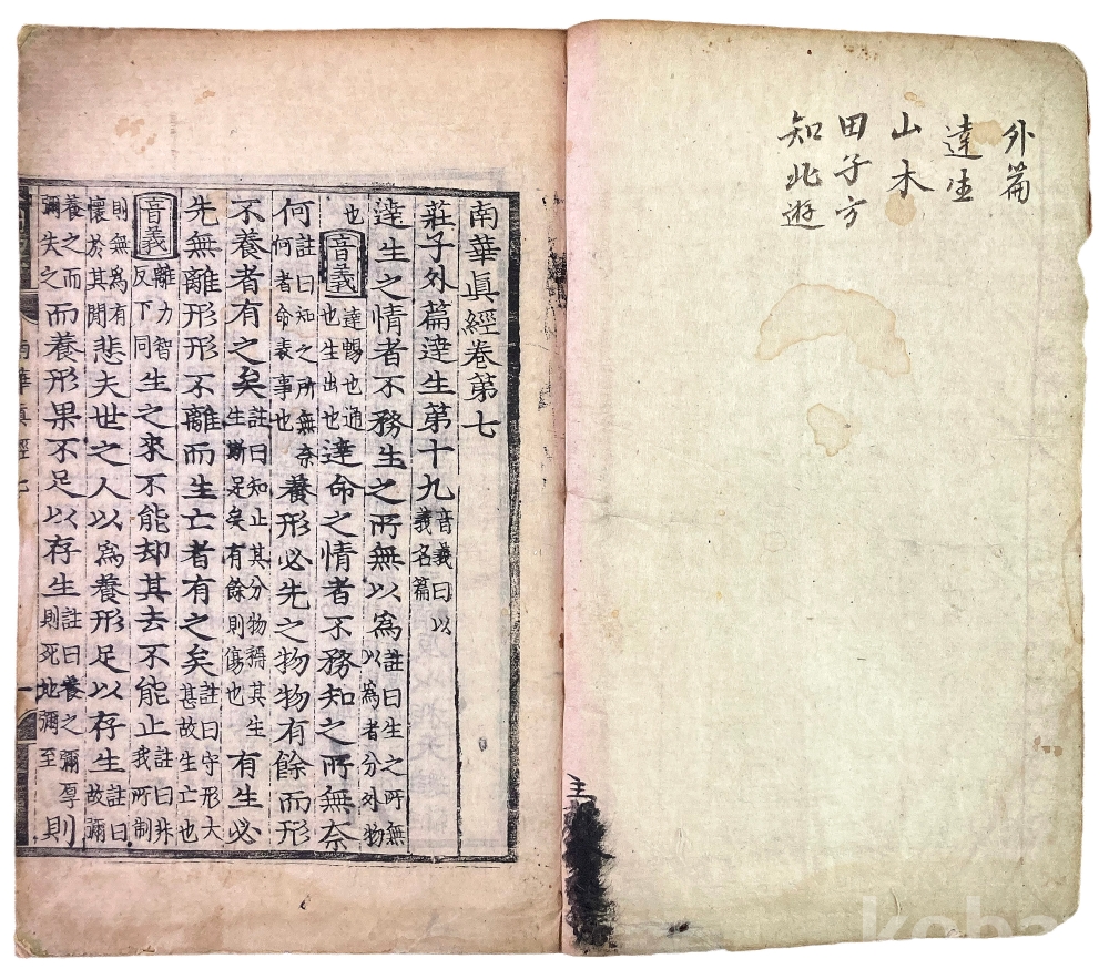 『남화진경』은 전국시대의 인물 장주(莊周)의 저서인 『장자(莊子)』를 높여서 부르는 말로, 전체 10권이며, 위 책은 권7에 해당합니다. 흔히 볼 수 있는 『구해남화진경』과는 다른 책이며, 을해자본뿐만 아니라 을해자 번각본 모두 임진왜란 이전에 간행되었으며, 매우 희귀한 책입니다. 권7에는 달생(達生), 산목(算木), 전자방(田子方), 지북유(知北遊) 등 4편이 수록되어 있습니다.