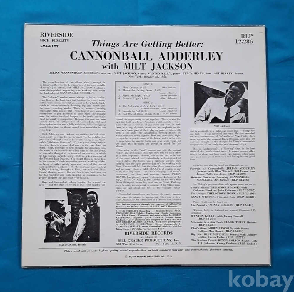 재즈 색소폰 연주자 캐넌볼 애덜리(Cannonball Adderley)와 비브라폰 연주자 밀트 잭슨(Milt Jackson)이 협연한 앨범 **"Things Are Getting Better lp 입니다