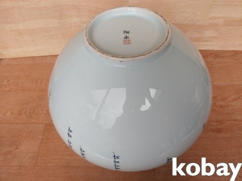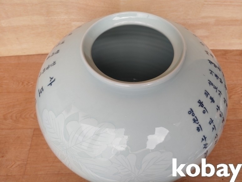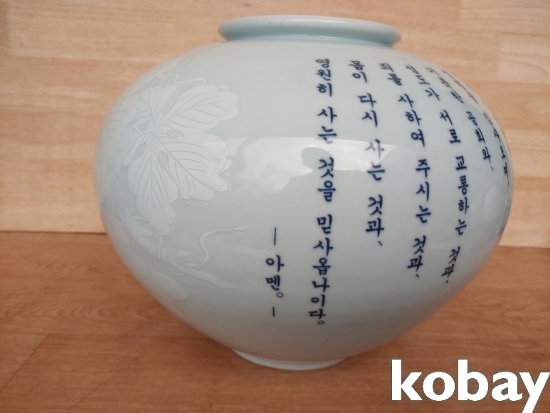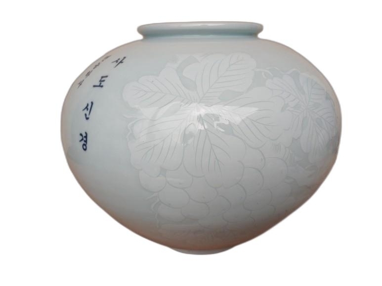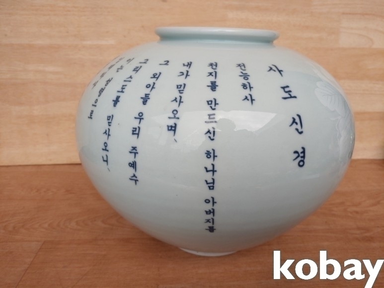 사도신경 글씨와 포도 문양이 있는 달 도자기 입니다.