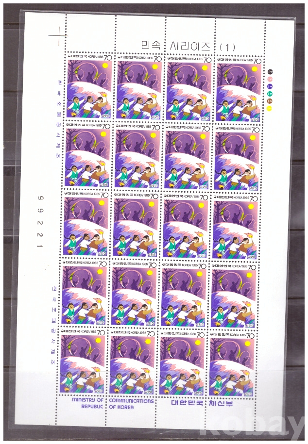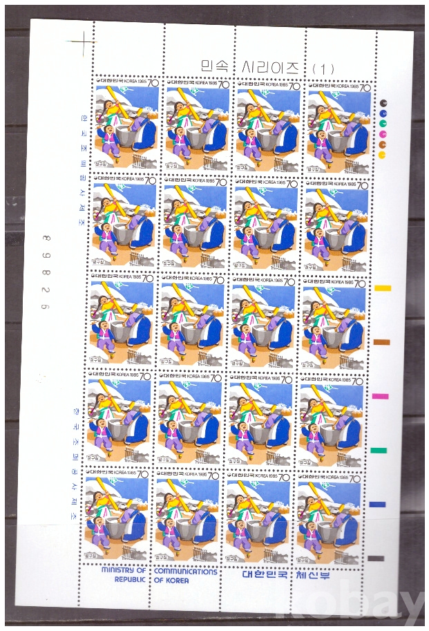 (한국전지) 1985.2.19 민속시리즈(제1집) 2완 sheet of 20 MNH