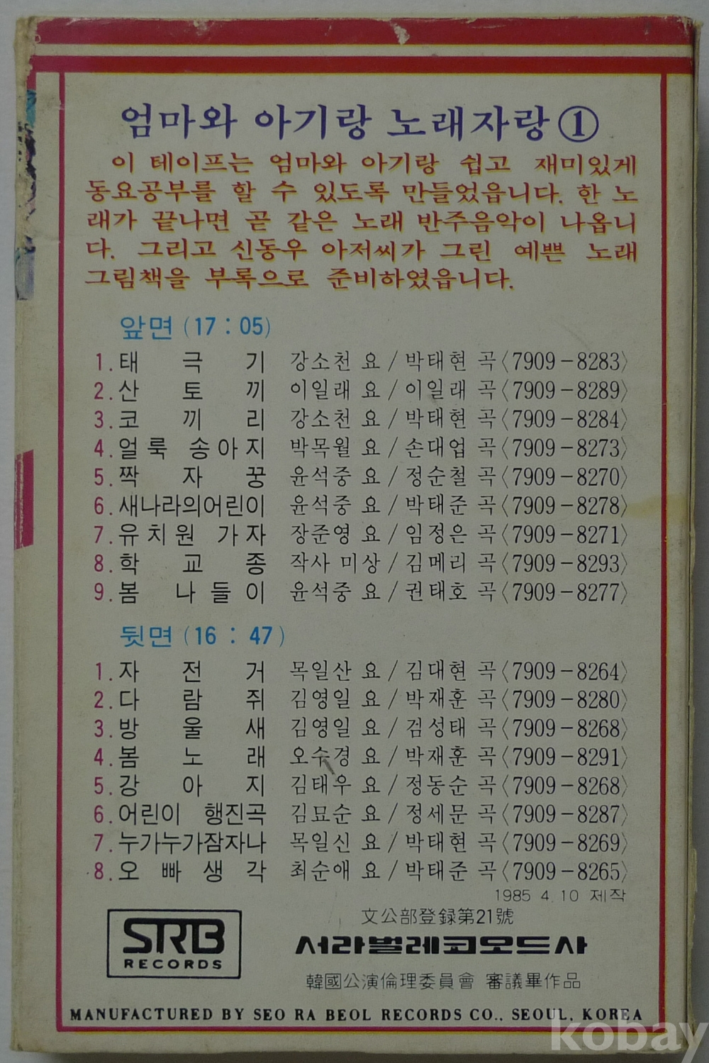 1985년 엄마랑 아기랑 노래 자랑 노래 그림책 카셋트 테이프
