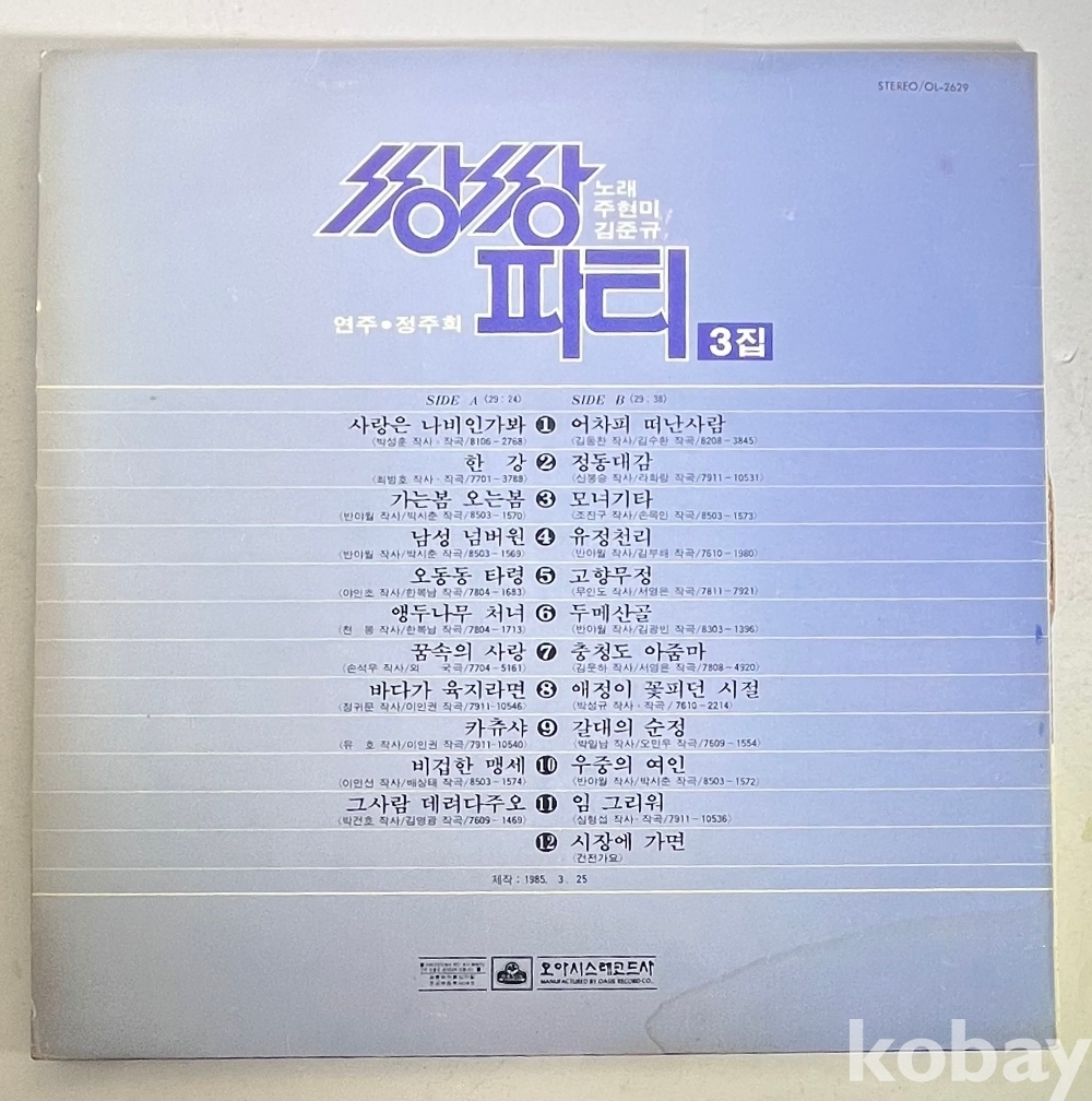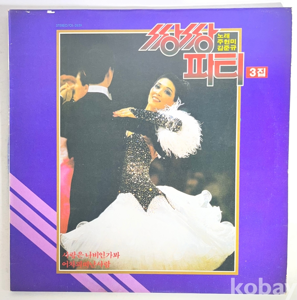 대한민국 트로트 메들리의 전설적인 명반, 주현미와 김준규의 <쌍쌍파티 3집> LP 음반입니다. 타이틀곡인 '사랑은 나비인가봐'와 '어차피 떠난사람'을 비롯해 주옥같은 명곡들이 수록되어 있습니다. 1985년 오아시스레코드사에서 발매된 음반으로, 레트로 감성을 찾으시는 분들이나 한국 가요/트로트 LP 수집가분들께 적극 추천해 드립니다.