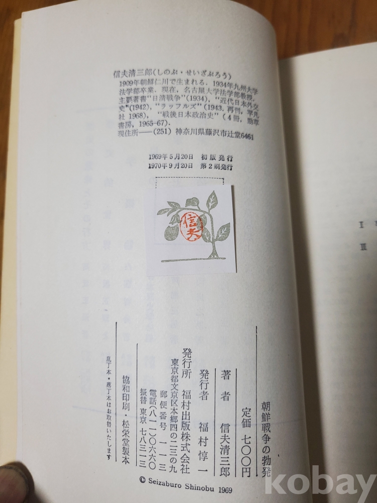 1. 조선전쟁의 발발, 신부청삼랑(信夫淸三郞), 부촌출판주식회사, 1970년, 284쪽, 일본판, 상태 상, 사진 참조