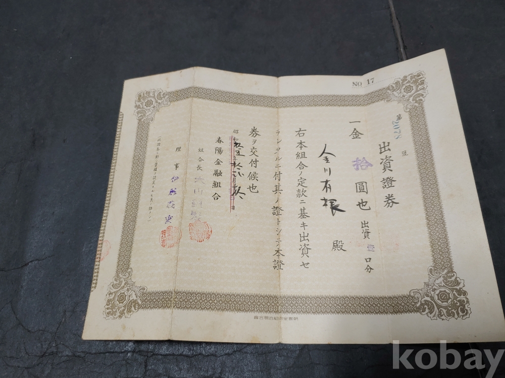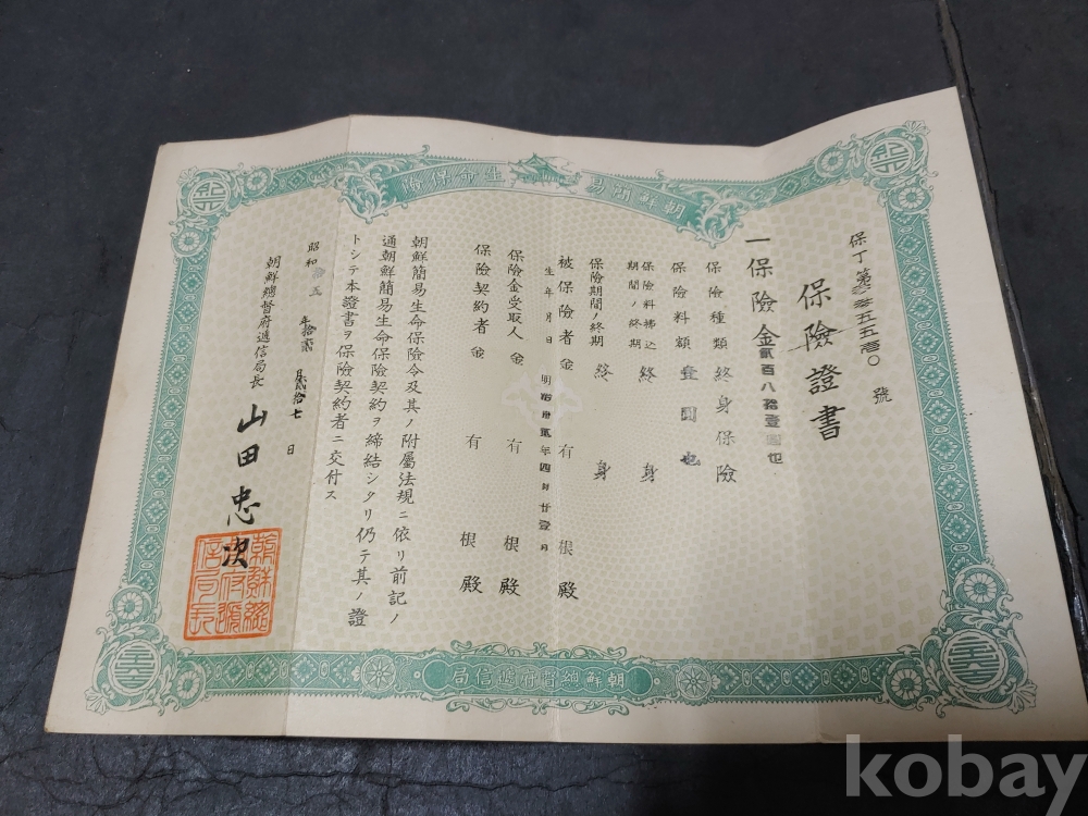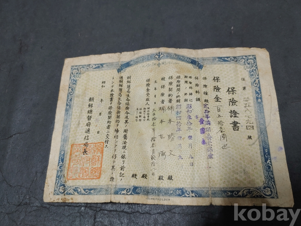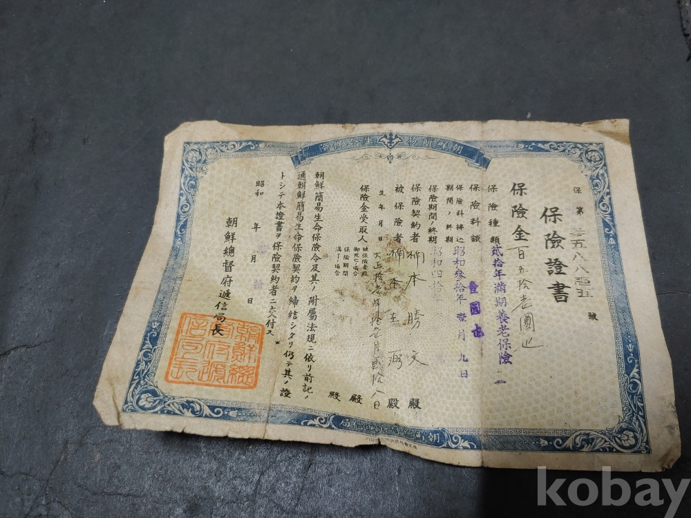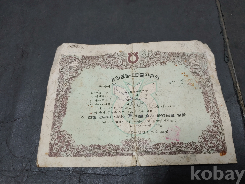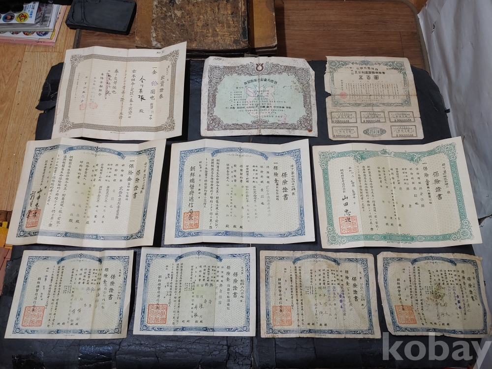""소화연도에 보험증서. 출자증권 8개와 1975년 농협협동조합출자증권. 1955년 제1회 오분리건국국채증서 2개등 10개 일괄""