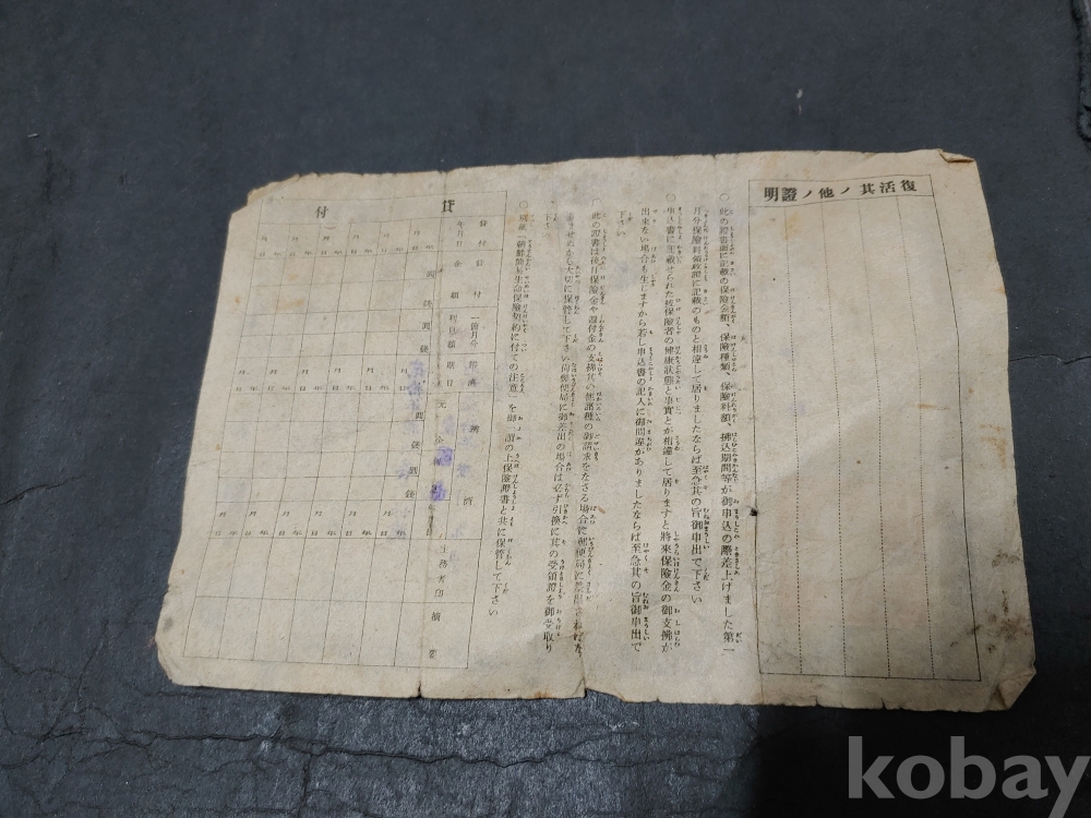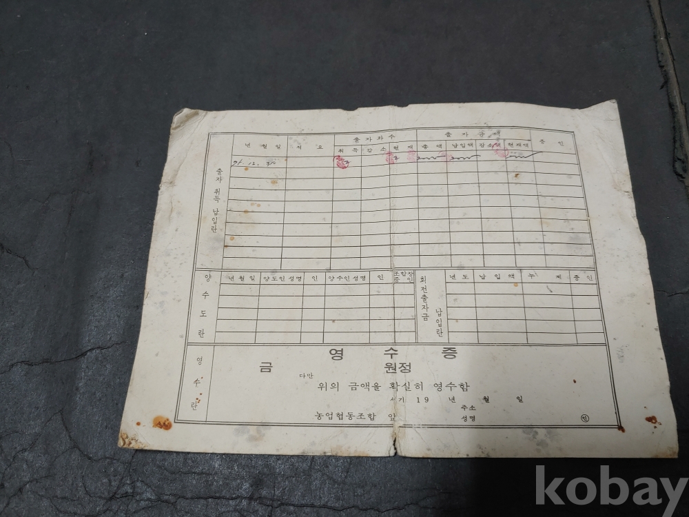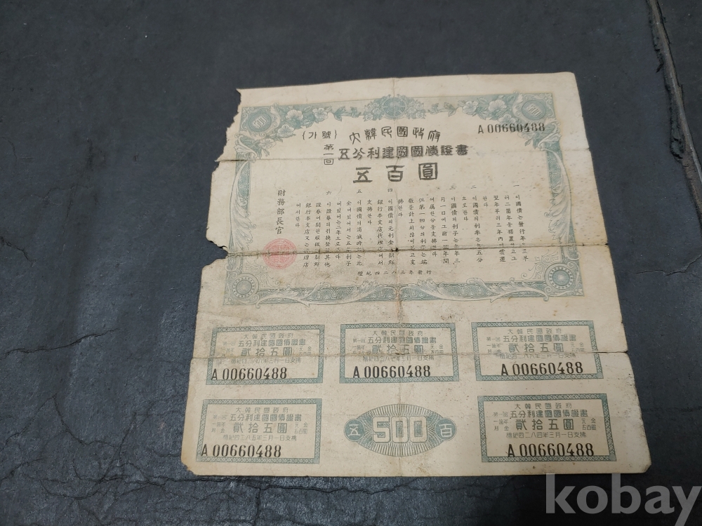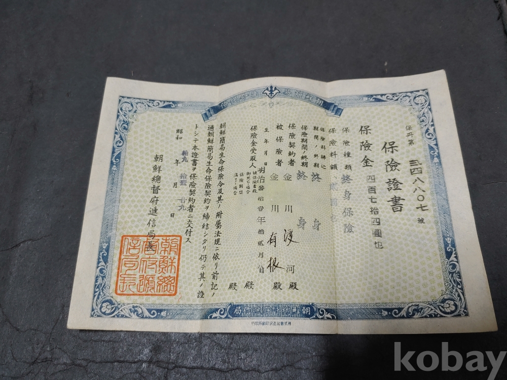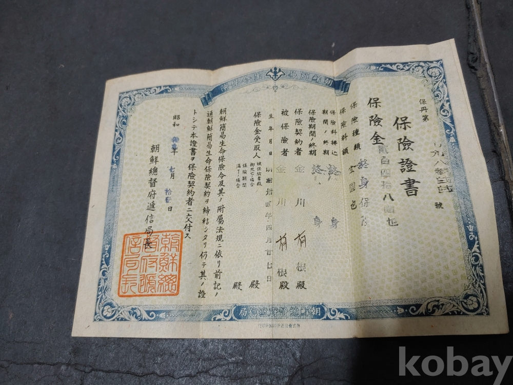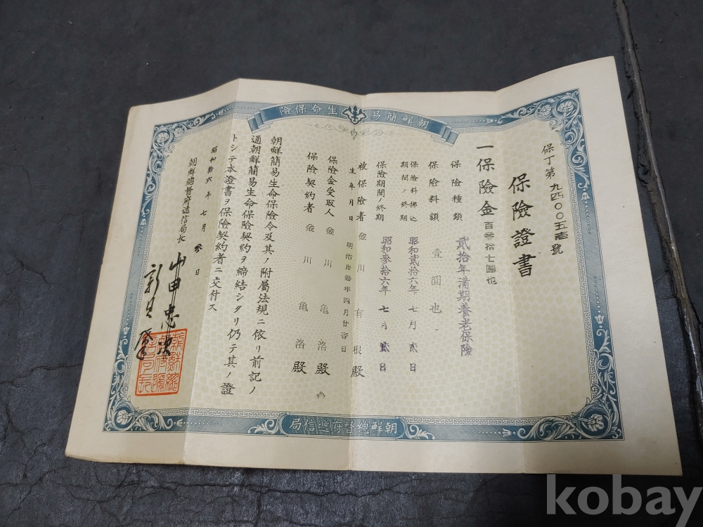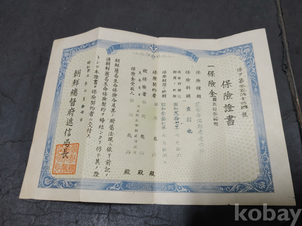 ""소화연도에 보험증서. 출자증권 8개와 1975년 농협협동조합출자증권. 1955년 제1회 오분리건국국채증서 2개등 10개 일괄""