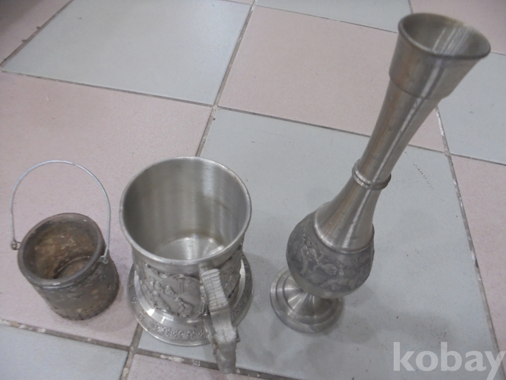 높은화병도 둘레에 더운나라 양각그림이들어간 꽃한송이꽂으면 운치가최고인 모두거의새것으로 사용소장전시에 최고좋은 무거운주석컵 화병등 3점
