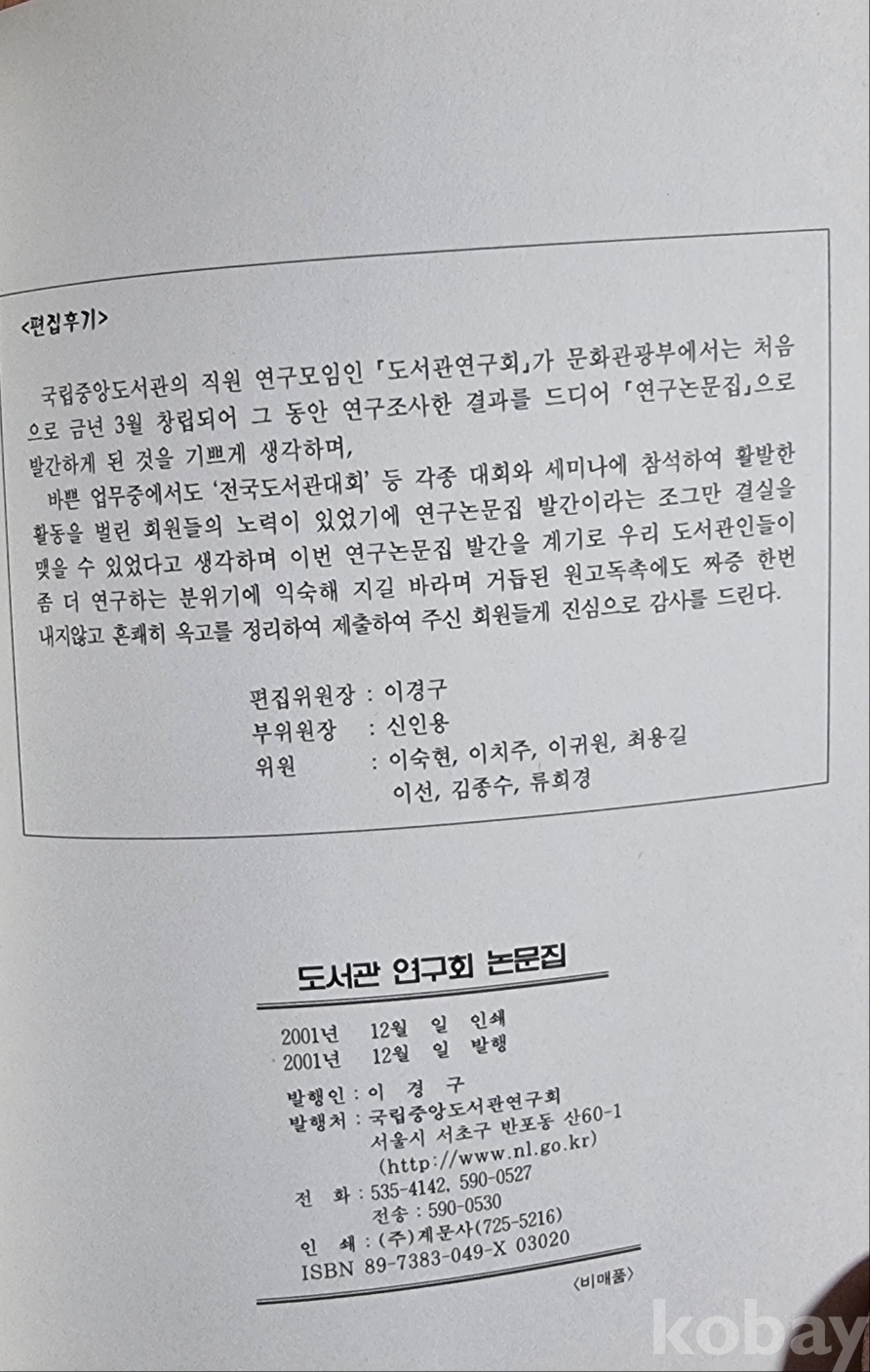 [8] <<2001 도서관연구회 논문집>> / 국립중앙도서관 연구회 편, 2001년 12월 8일 발행 초판